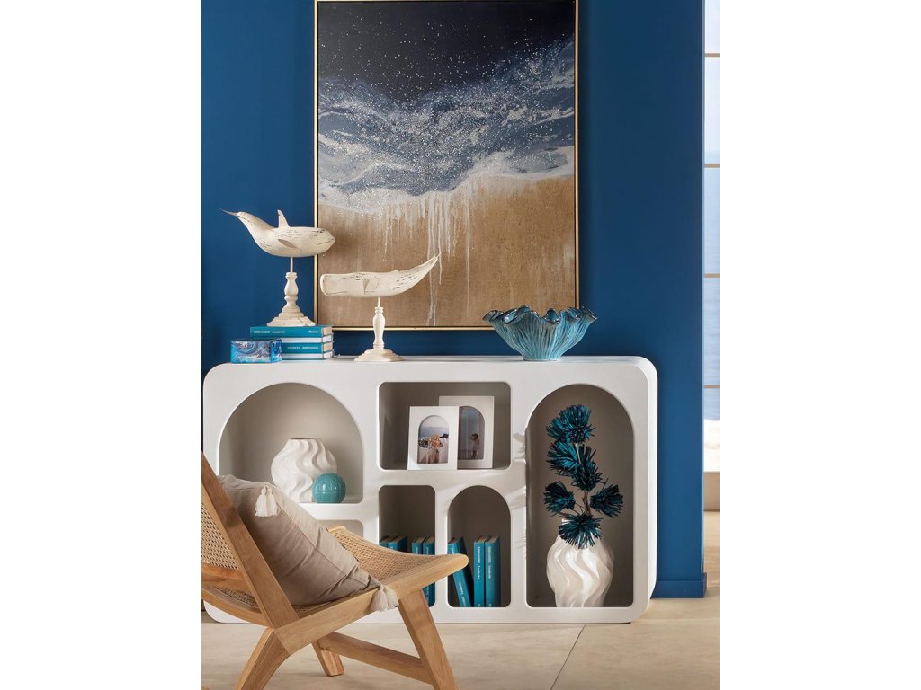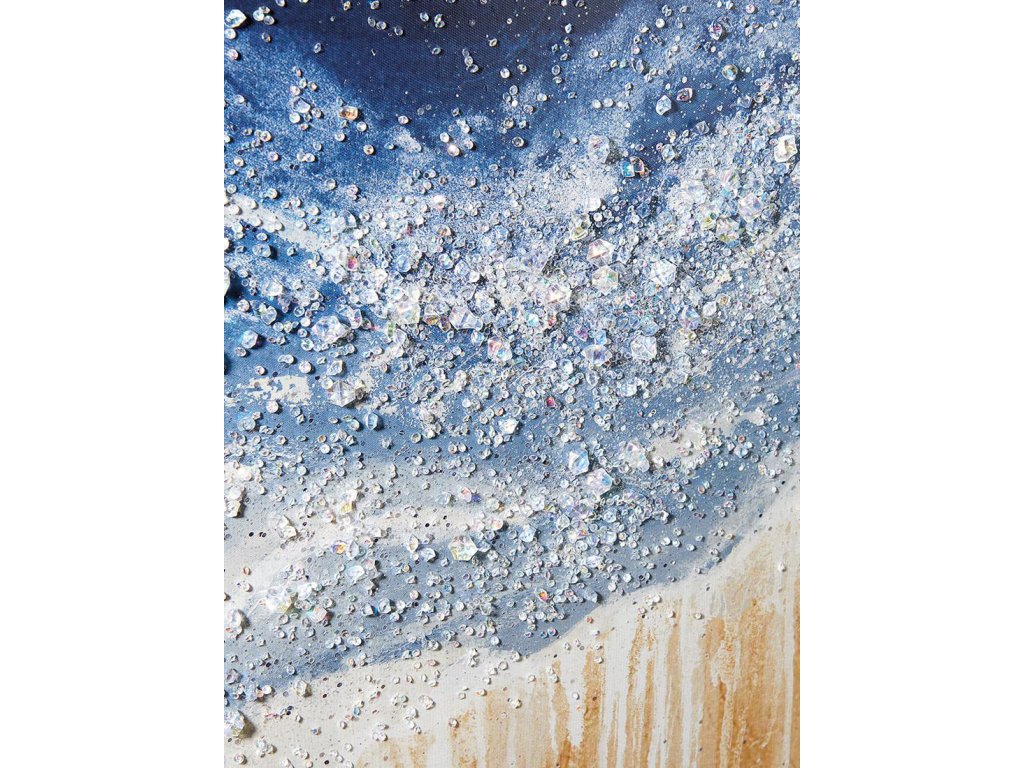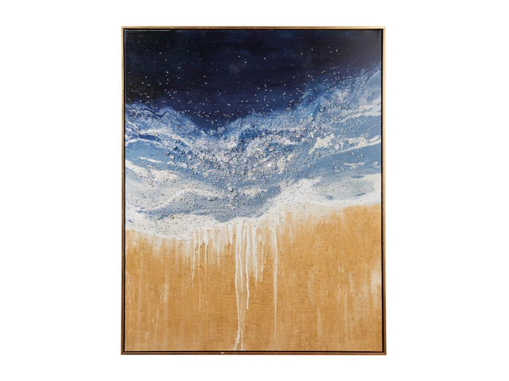 Rámovaný obraz vyrobený technikou sieťotlače na plátne s kamienkami. Dekorácia, ktorá evokuje pobrežie obmývané vlnami. Kamienky skrášľujú plátno detailmi dúhového svetla.