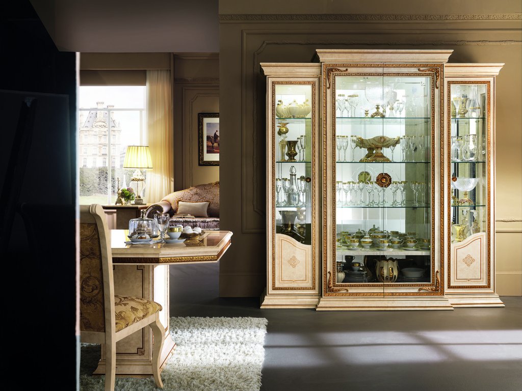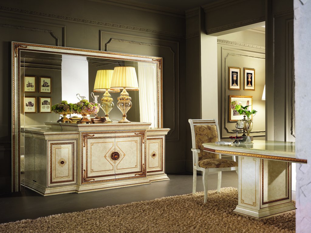 Rámy, ozdobné rímsy a korunky z plátkového zlata pôvabne obohacujú čistotu nábytku, zvýrazňujú lineárnosť rámov a pomocou svojho dekoru vytvárajú pohyb a súčasne dodávajú celej kompozícii harmóniu.