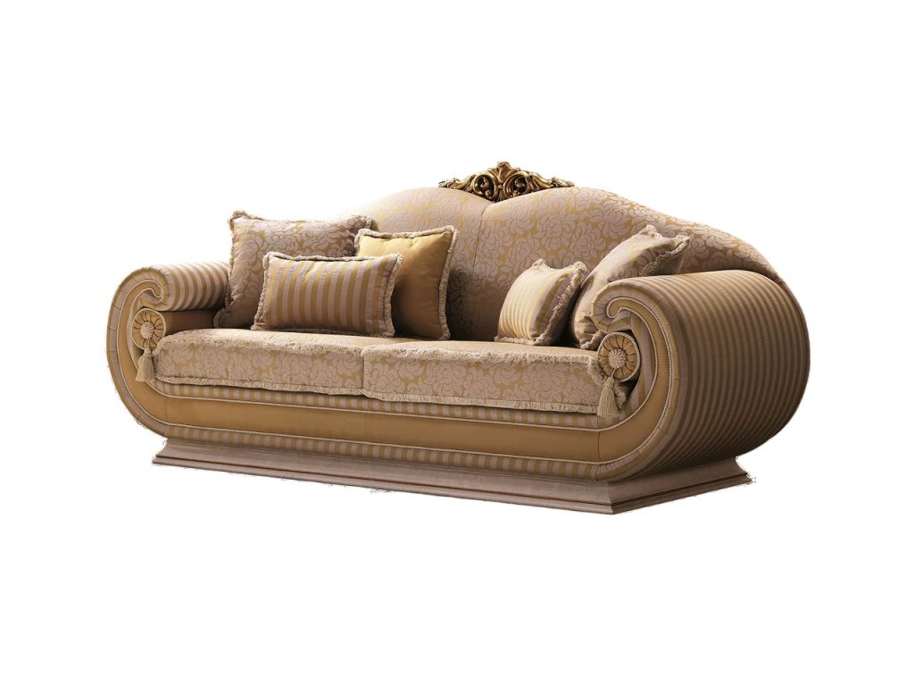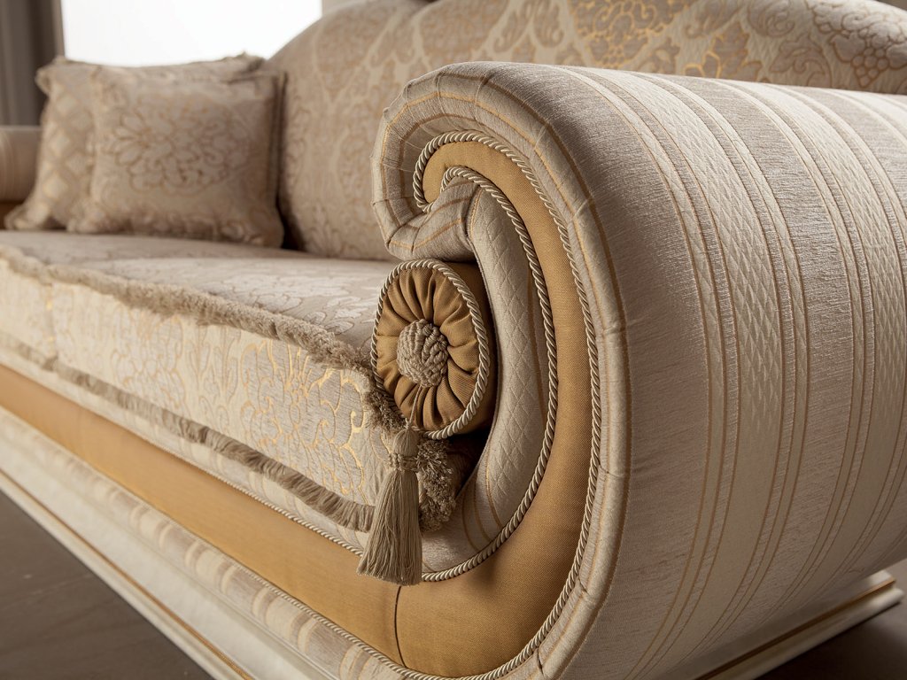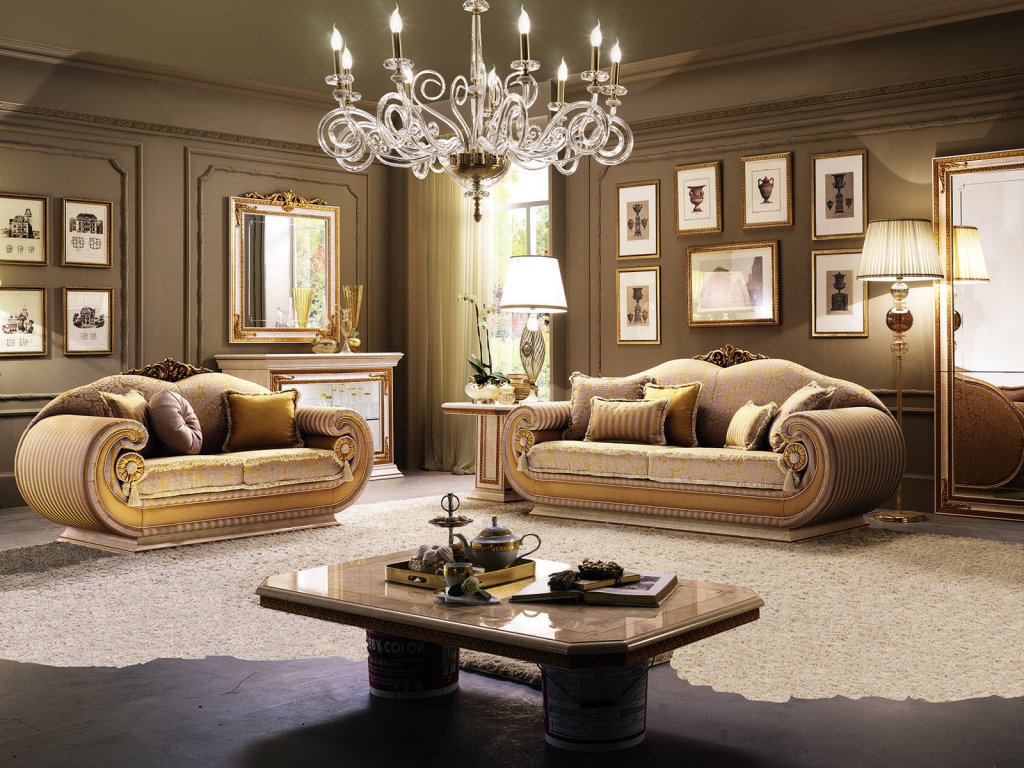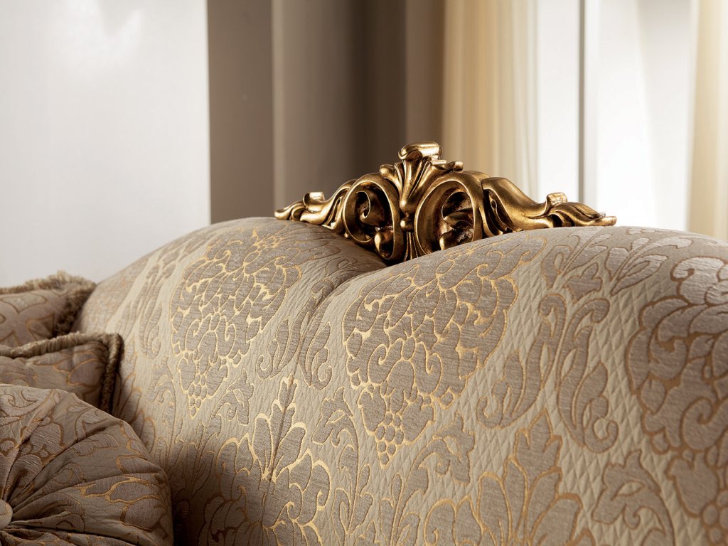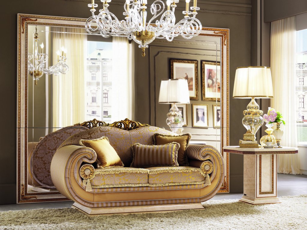 Rámy, ozdobné rímsy a korunky zo zlatého dekoru, sofistikovane obohacujú čistotu nábytku, zdôrazňujú lineárne rysy rámov a svojím dekorom prinášajú dynamiku, zatiaľ čo zároveň celej kompozícii dodávajú harmóniu.