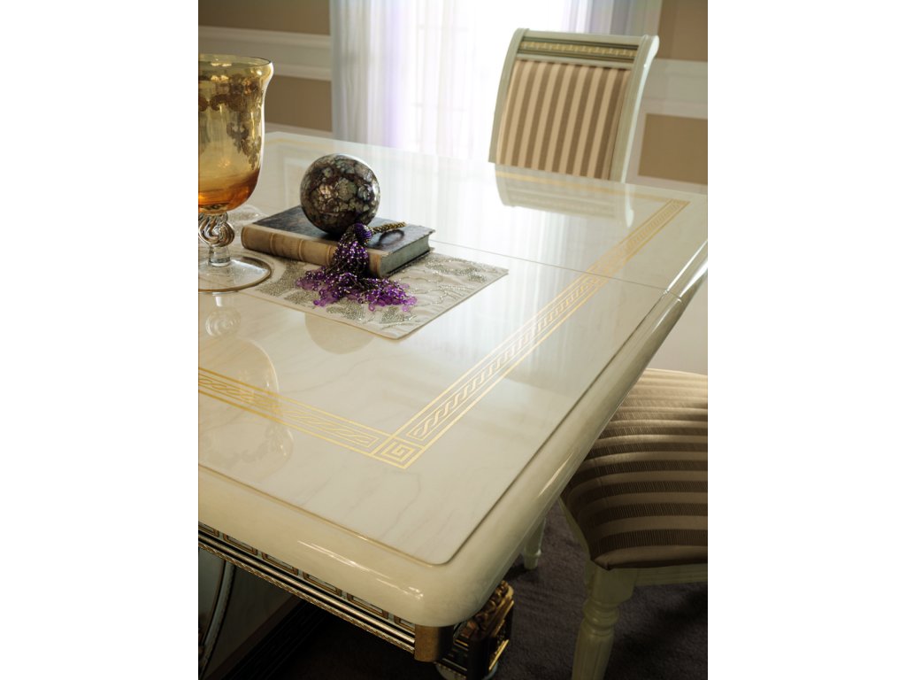 Povrch s mramorovým dekorom v krémových tónoch ladí s elegantnými striebornými rámami, doplnenými dotykmi pozlátených dekorácií.