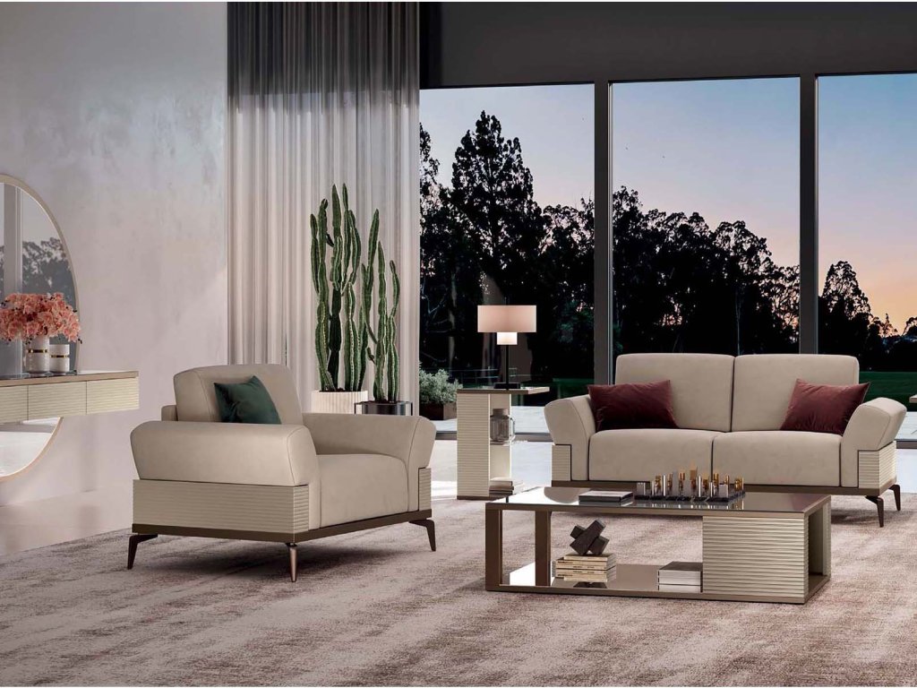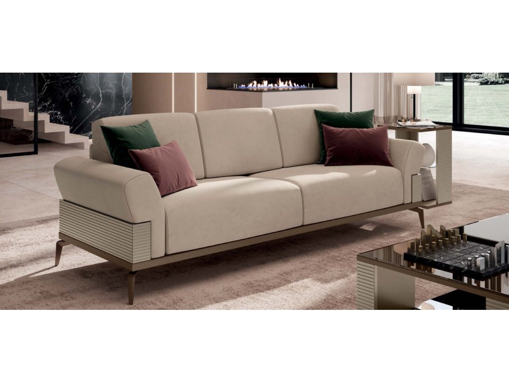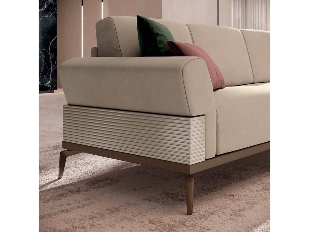 Výrazným prvkom sú aj geometrické kovové podstavce s bronzovou povrchovou úpravou, ktoré elegantne ladia s hranami nábytku. Tieto detaily nielen definujú dizajn jednotlivých kúskov, ale tiež ich vizuálne odľahčujú, čím im dodávajú pocit ľahkosti a nadnesenosti.