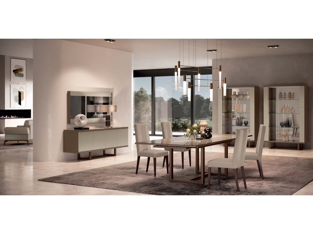 Výrazným prvkom sú aj geometrické kovové podstavce s bronzovou povrchovou úpravou, ktoré elegantne ladia s hranami nábytku. Tieto detaily nielen definujú dizajn jednotlivých kúskov, ale tiež ich vizuálne odľahčujú, čím im dodávajú pocit ľahkosti a nadnesenosti.
