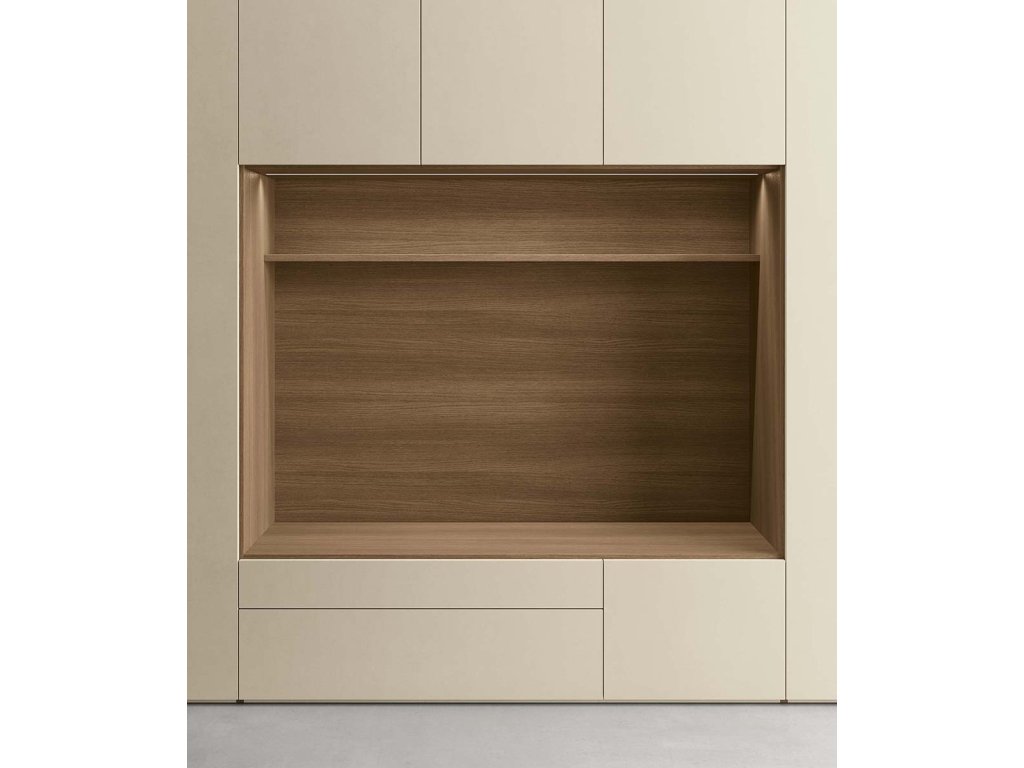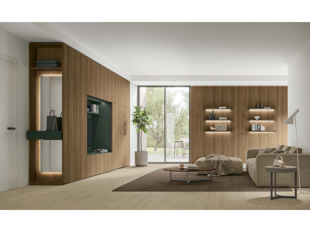 Na jedinej stene sa harmonicky kombinuje vstupný priestor, obývacia časť s TV zónou a praktická domáca kancelária. Vďaka dôrazu na detail, kontrastom farieb a integrovanému osvetleniu vzniká zostava, ktorá premení váš interiér na útulné a štýlové miesto s talianskym charakterom.