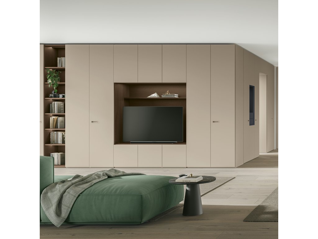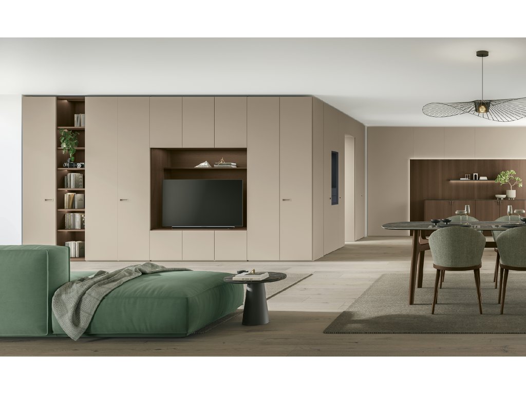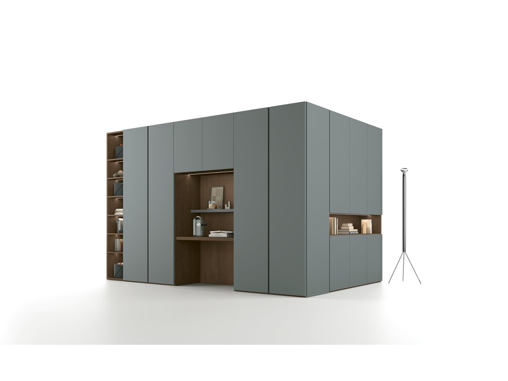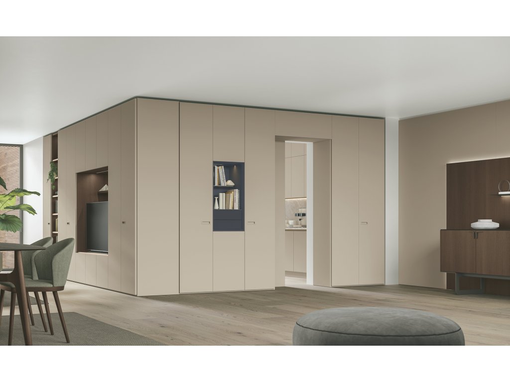 - Otvorená rohová konfigurácia so skrinkovým systémom v dekore Rovere Moka, materico opaco Arena a lakovaní Blu di Prussia 181.