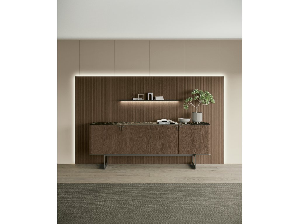 Dvojitá boiserie (systém panelov) GLOVE zvýrazňuje stenu za komodou Pandora a prináša rafinovanú hru štruktúr – kombináciu matného materiálu Arena a podsvieteného prevedenia Traccia Rovere Moka, ktoré umocňuje celkový estetický dojem.