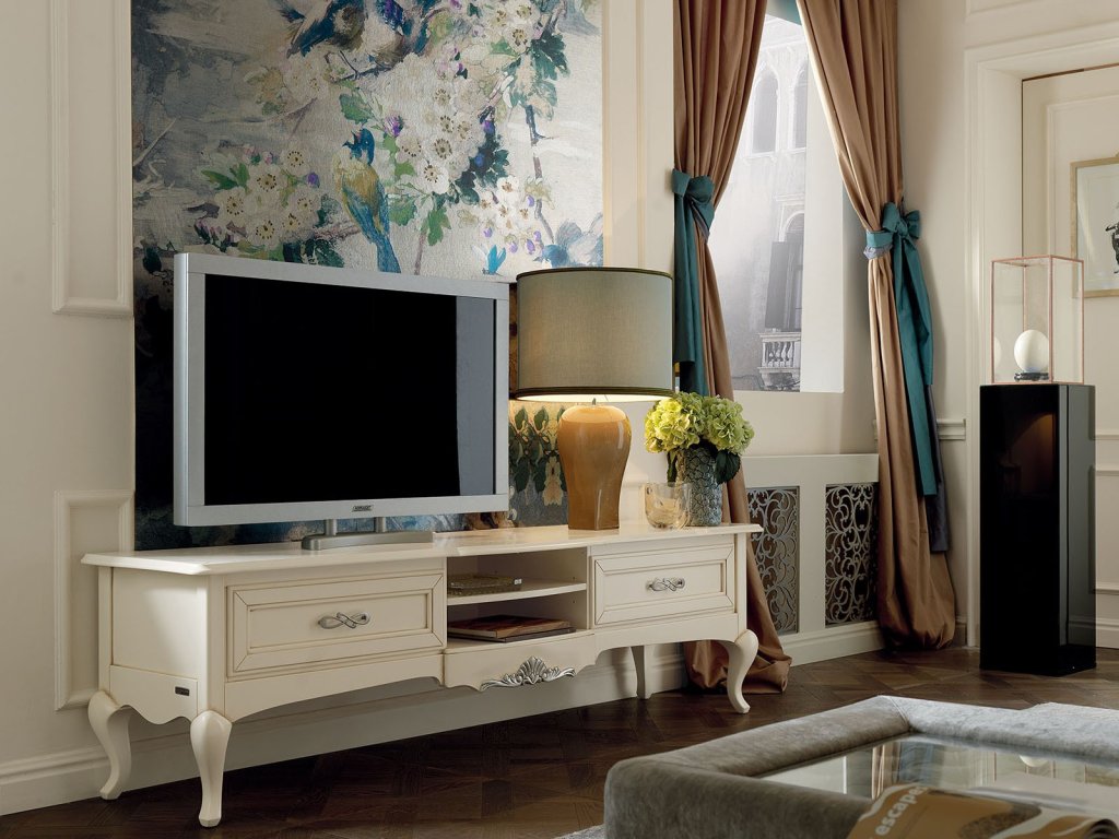 Súprava pre obývaciu izbu zahŕňa vitríny, komody, konzolové a konferenčné stolíky, TV skrinky či zrkadlá – všetko navrhnuté tak, aby spolu vytvárali harmonický celok s dôrazom na remeselnú hodnotu a dekoratívne detaily.