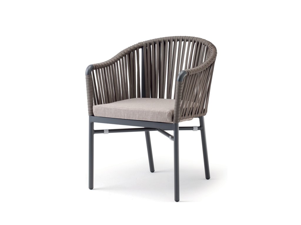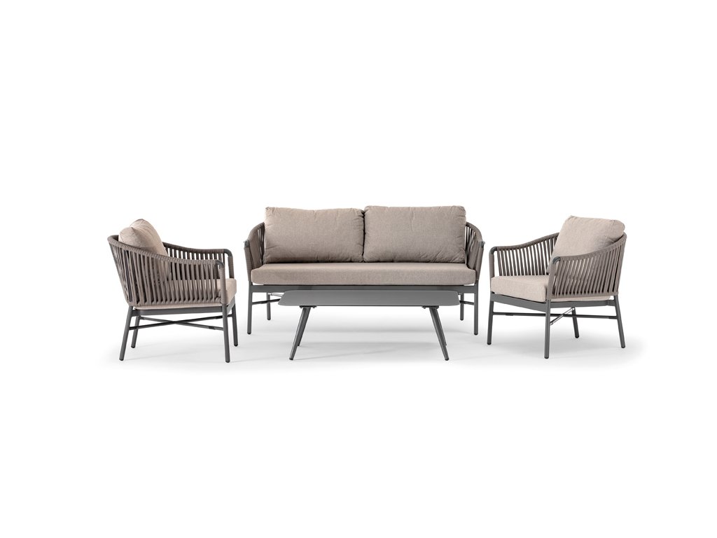 MONACO záhradné sedenie je dostupné v antracitovej farbe konštrukcie, opletenej textilným lanom vo farbe taupe. Vankúše sú z vodoodpudivej látky olefin a majú odnímateľné poťahy. Stolík JOLLY má konštrukciu a dosku z hliníku v antracitovej farbe.