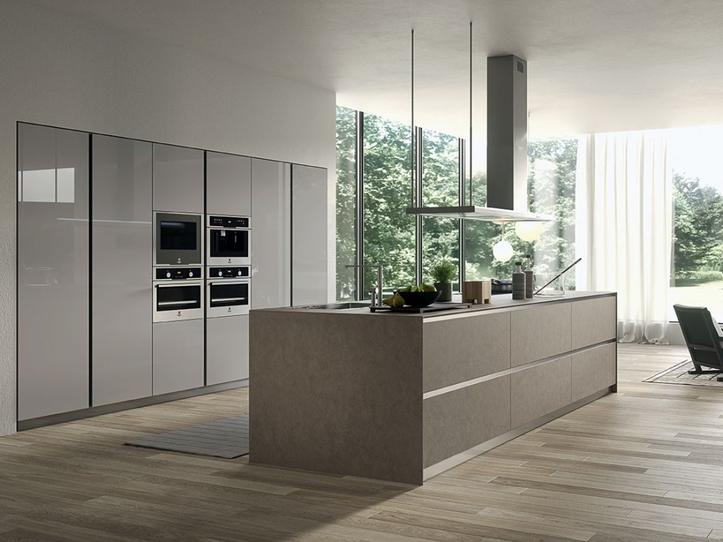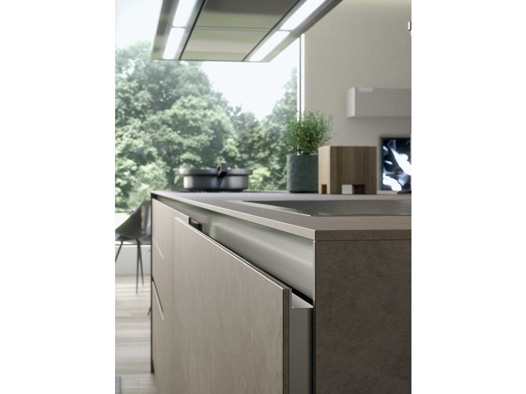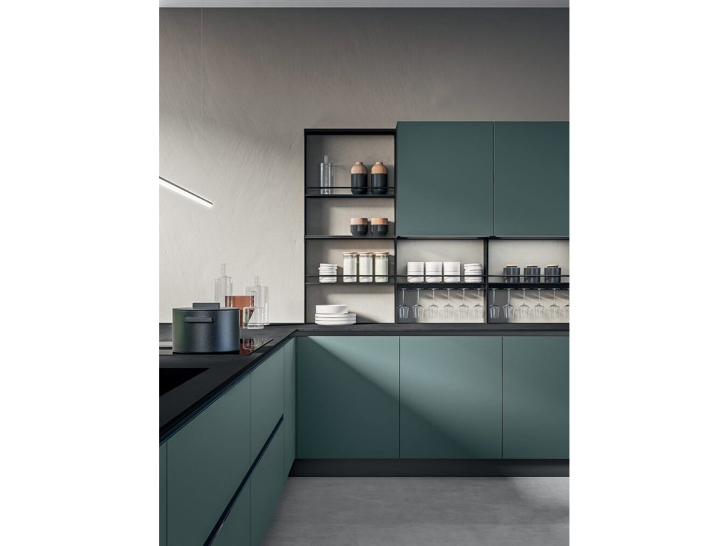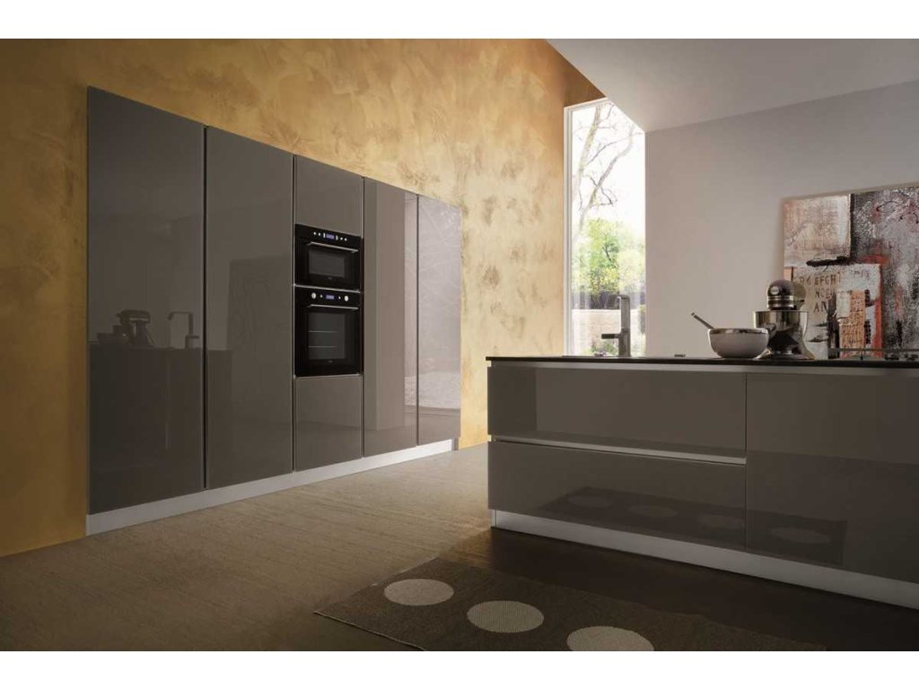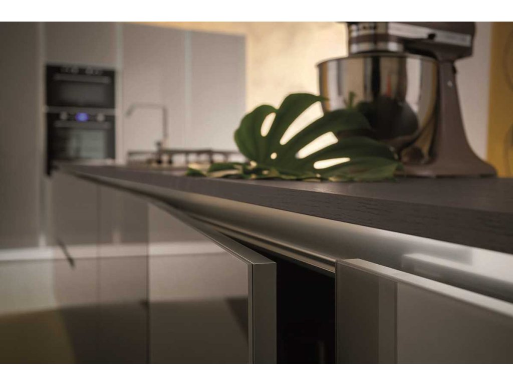 Kuchynská zostava MYGLASS ponúka riešenie s úchytkami alebo bez úchytkové riešenie „GOLA SYSTEM“.