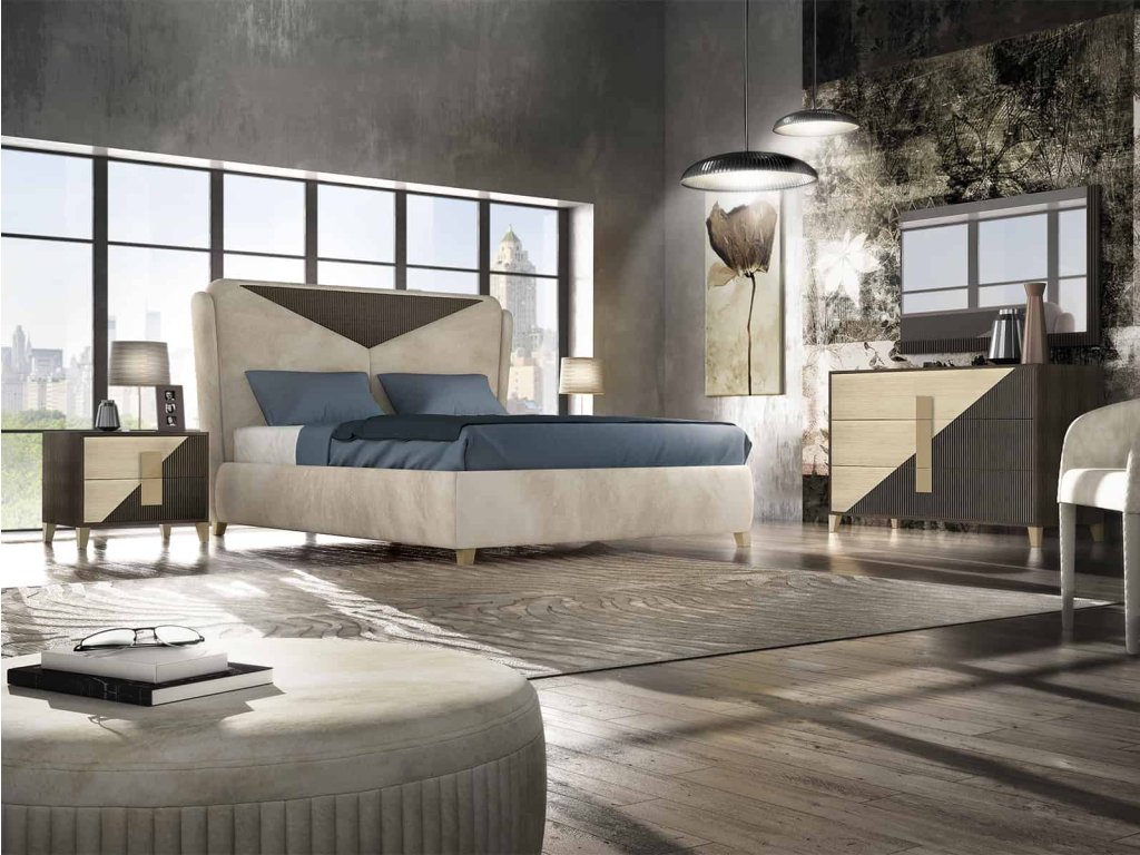 Kolekcia talianskeho nábytku NEW HARMONY obsahuje manželskú posteľ vo viacerých rozmeroch, nočný stolík a komodu so zrkadlom.