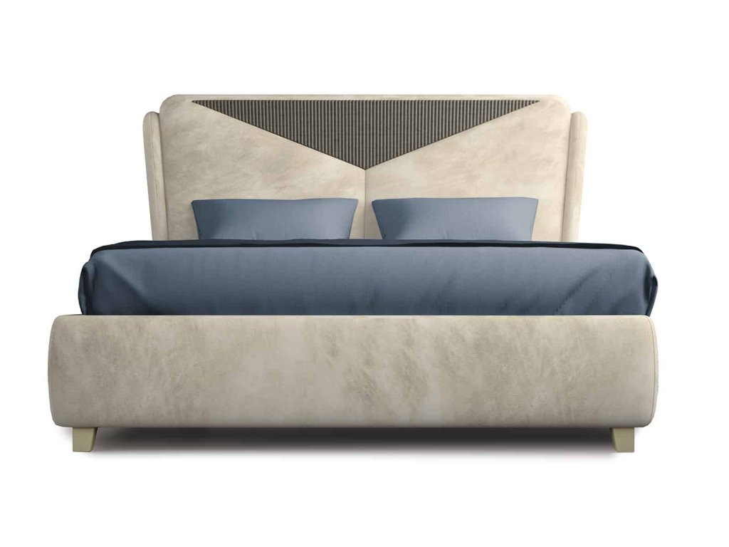 Kombinácia látok na čalúnení s dreveným dekórom dodáva posteli šarm a eleganciu.
