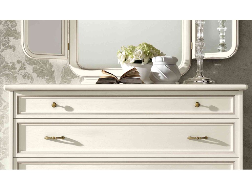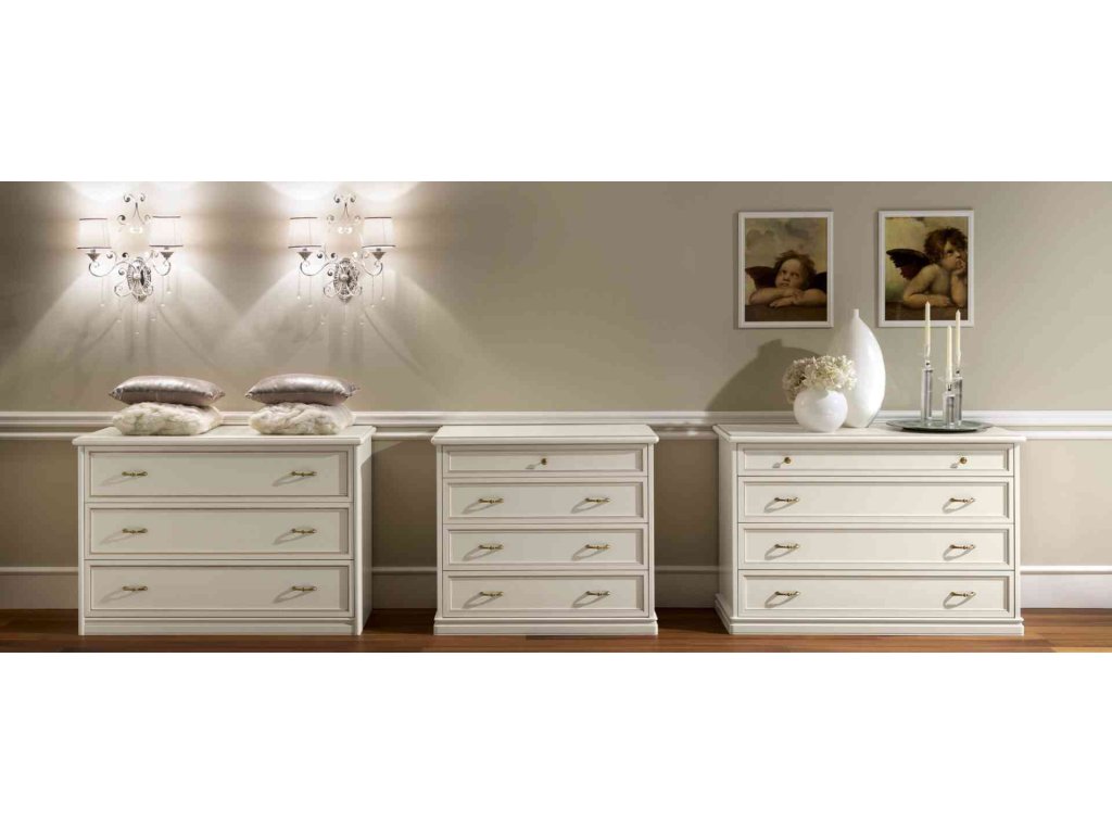 Nadčasová rustikálna spálňa NOSTALGIA BIANCO ANTICO ponúka nasledovné kusy spálňového nábytku: posteľ, nočné stolíky, komodu, šatníkové skrine, toaletný stolík, zrkadlo a ležadlo.
