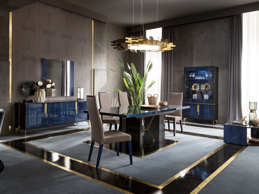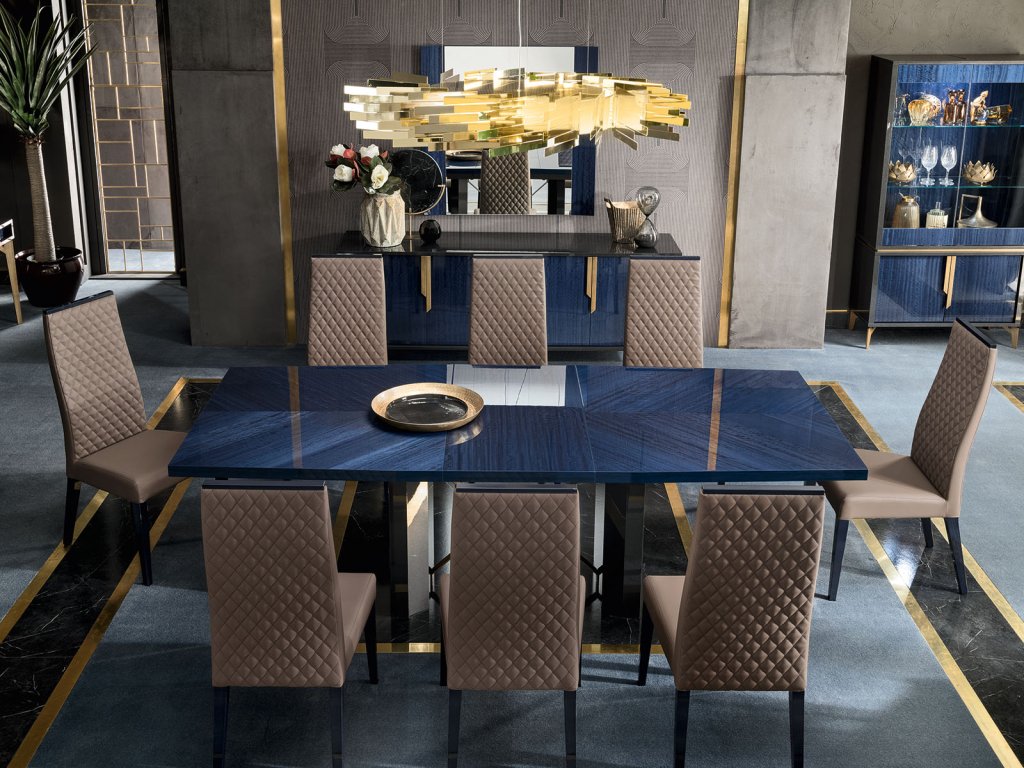 Neskutočne dobre prepracovaná kombinácia kobaltovej modrej lesklej drevenej dyhy / COBALT EUCALYPTUS HIGH GLOSS/ a tmavo šedej metalickej povrchovej úpravy vo vysokom lesku / METAL DARK GREY ECO VENEER HIGH GLOSS/. Exkluzivitu materiálov dopĺňajú kovové úchytky, nožičky a iné detaily v brúsenej mosadzi.