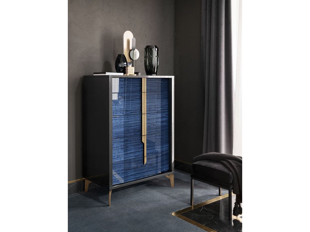 Neskutočne dobre prepracovaná kombinácia kobaltovej modrej lesklej drevenej dyhy / COBALT EUCALYPTUS HIGH GLOSS/ a tmavo šedej metalickej povrchovej úpravy vo vysokom lesku / METAL DARK GREY ECO VENEER HIGH GLOSS/. Exkluzivitu materiálov dopĺňajú kovové úchytky, nožičky a iné detaily v brúsenej mosadzi.