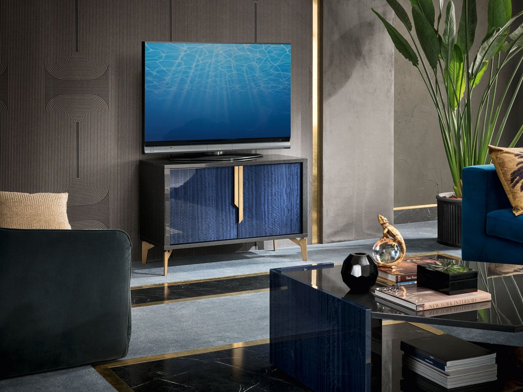 Neskutočne dobre prepracovaná kombinácia kobaltovej modrej lesklej drevenej dyhy / COBALT EUCALYPTUS HIGH GLOSS/ a tmavo šedej metalickej povrchovej úpravy vo vysokom lesku / METAL DARK GREY ECO VENEER HIGH GLOSS/. Exkluzivitu materiálov dopĺňajú kovové úchytky, nožičky a iné detaily v brúsenej mosadzi. Vašu obývačku v štýle Art Decó si môžete zariadiť funkčnou dizajnovou TV skrinkou. Nesmie chýbať dostatok úložného priestoru – tento Vám poskytne komoda/príborník, jednodverová alebo dvojdverová vitrína, ktoré sú osvetlené LED svetlom. Dostupná je aj menšia komoda. Samozrejmosťou v obývacej izbe sú konferenčné stolíky. Ak túžite mať zariadený interiér Vašej dennej časti domu v jednotnom dizajne, kolekcia OCEANUM Vám ponúka nábytok pre zariadenie jedálenskej časti v identickom dizajne.