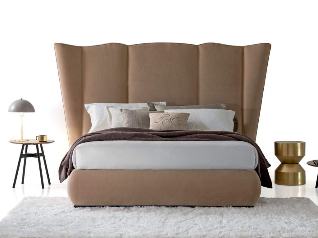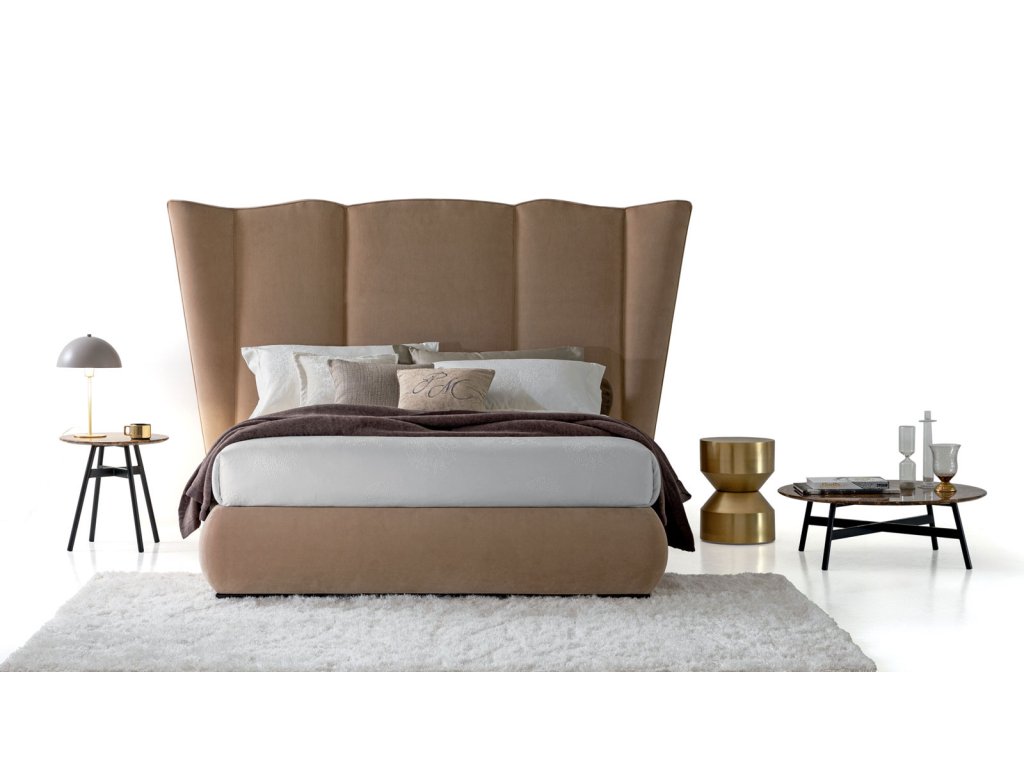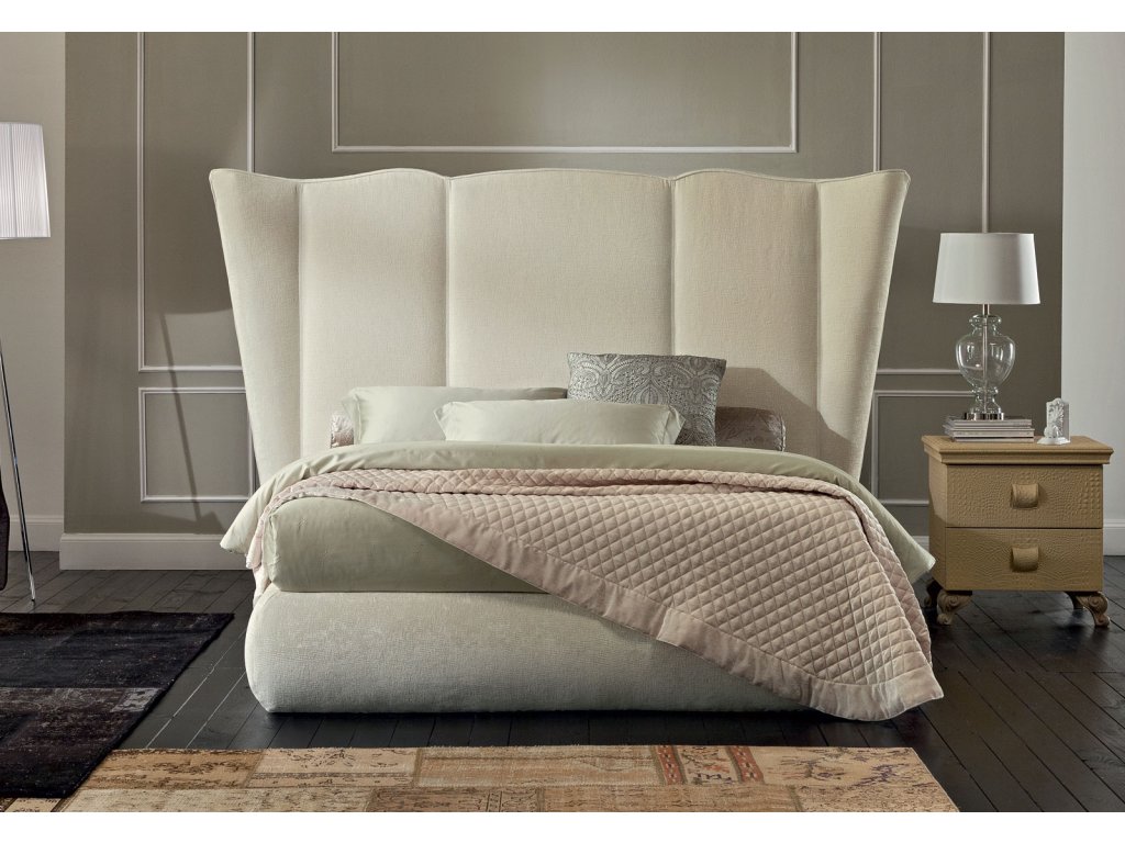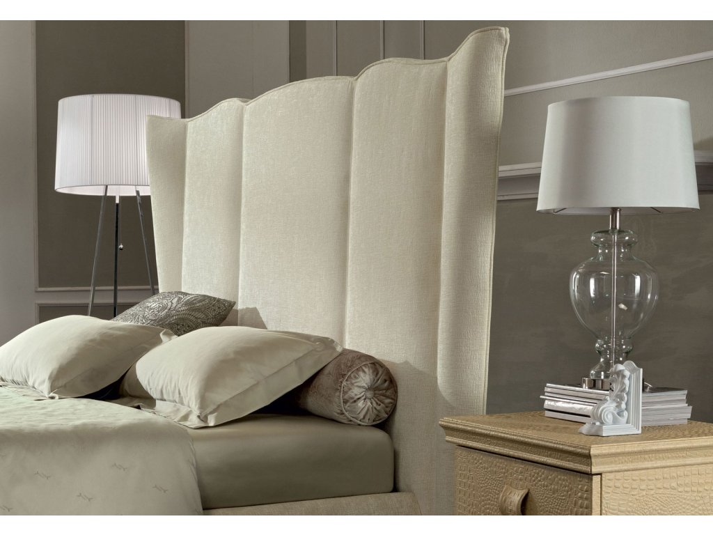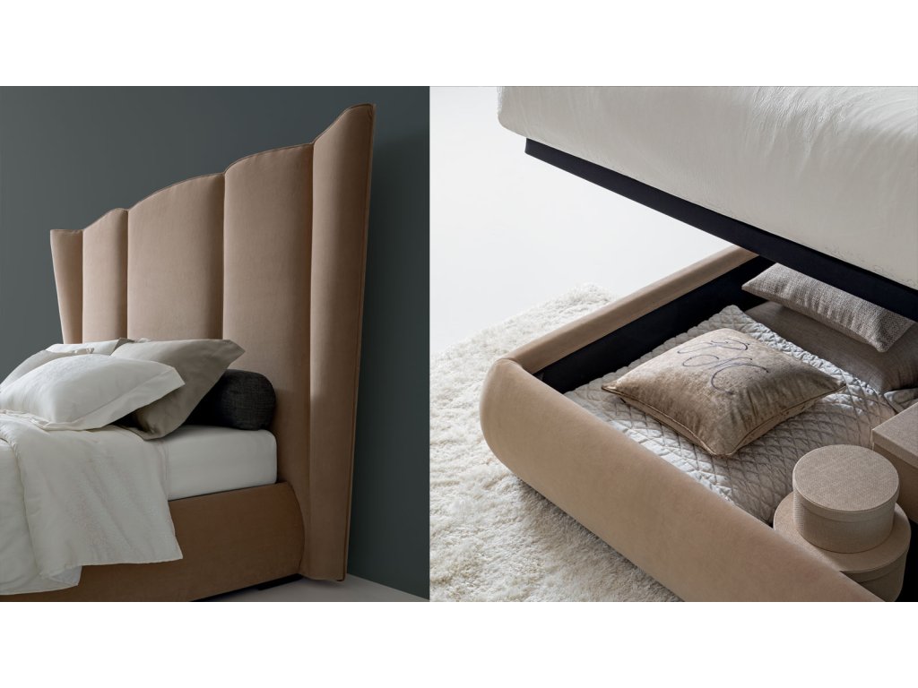 Čalúnená posteľ OPERA SIPARIO je špecifická svojim majestátnym čalúneným čelom. Čalúnenie postele je dostupné v širokej škále látok a koží, konštrukcia postele je z dreva.