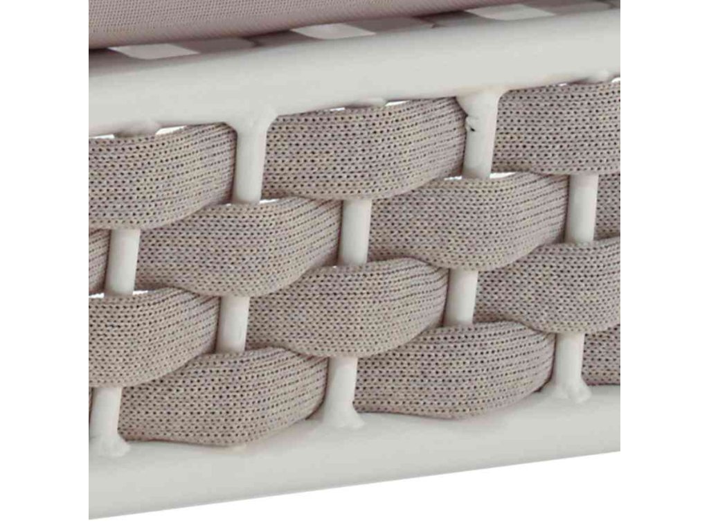 - Hliníková konštrukcia je dostupná v bielej farbe s béžovým výpletom a champagne vankúšom, alebo konštrukcia v antracitovej farbe s hnedým výpletom a vankúšom vo farbe taupe.