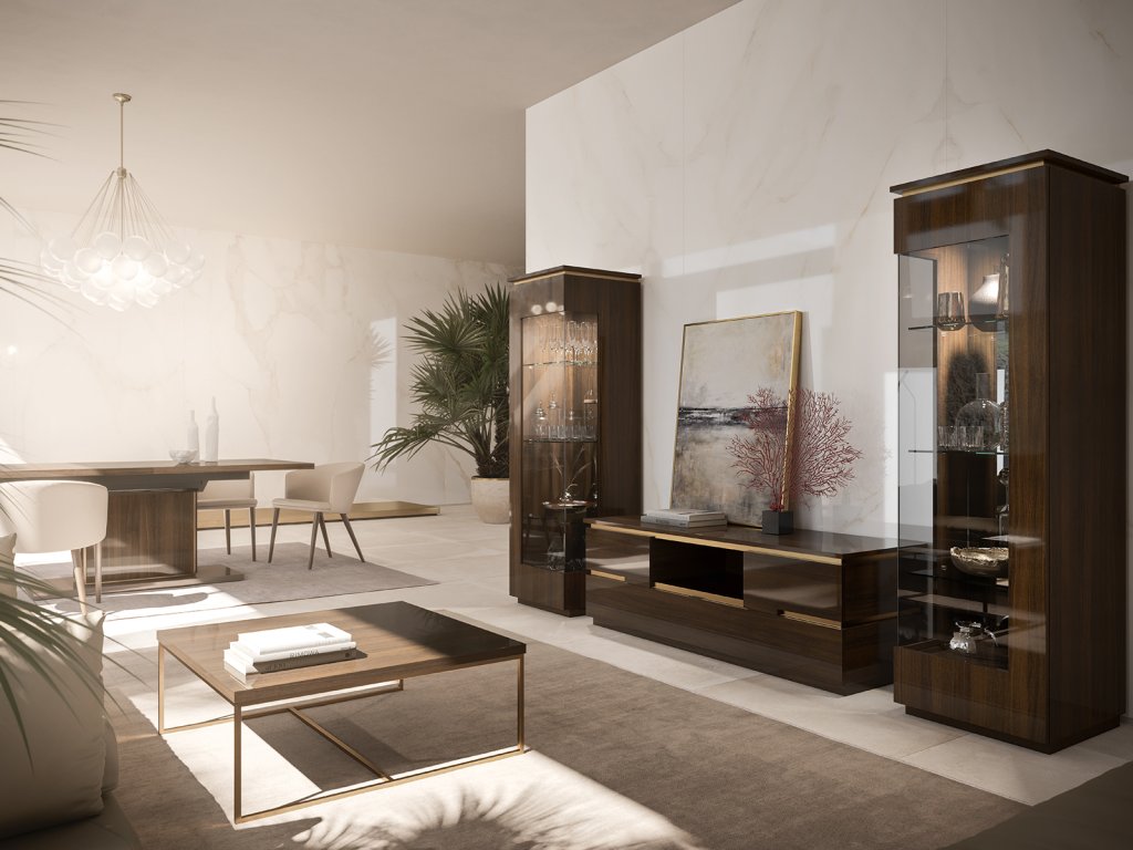 - Farebné prevedenie – hnedý tmavý dub vo vysokom lesku - ROVERE TERMOCOTTO v kombinácií s kovom v zlatej matnej farbe
