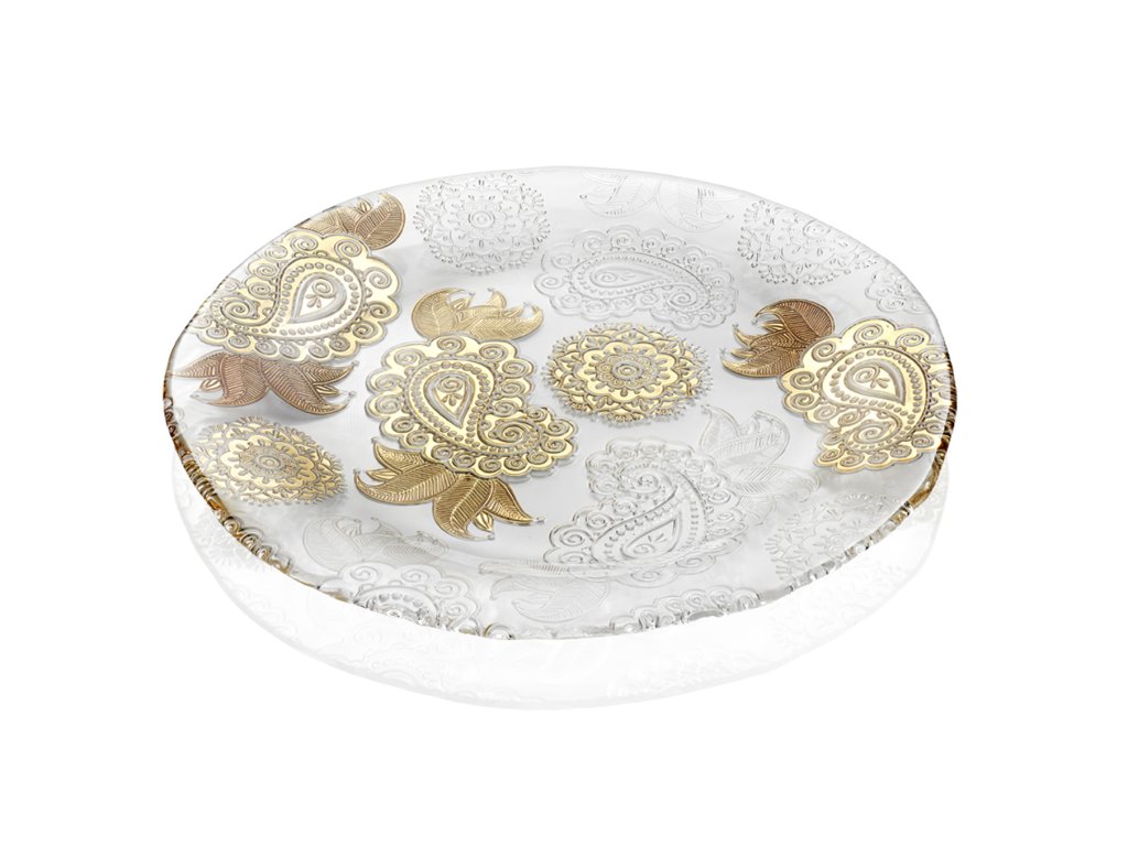 Ozdobná misa IVV PASHMINA 8134.3 je súčasťou kolekcie z číreho skla so zlatou dekoráciou.