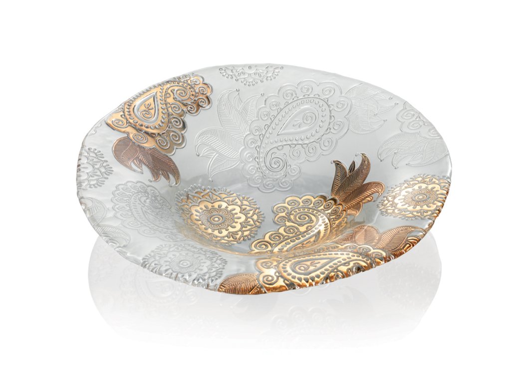 Ozdobná misa IVV PASHMINA 8136.2 je súčasťou kolekcie z číreho skla so zlatou dekoráciou.