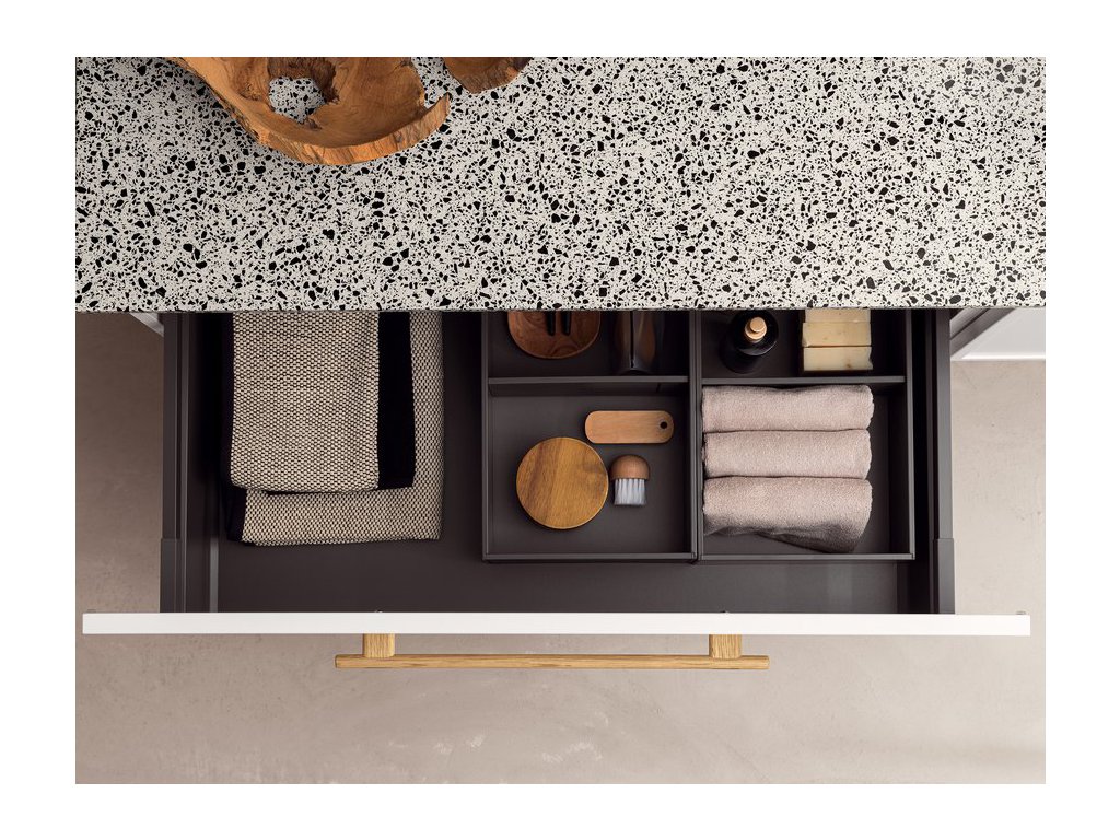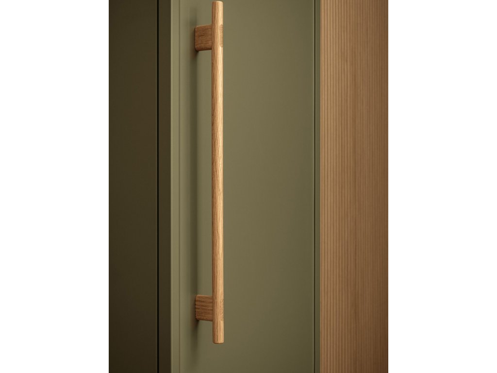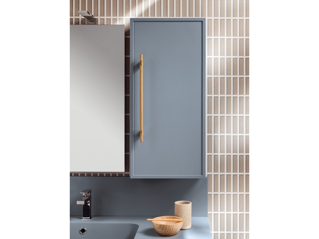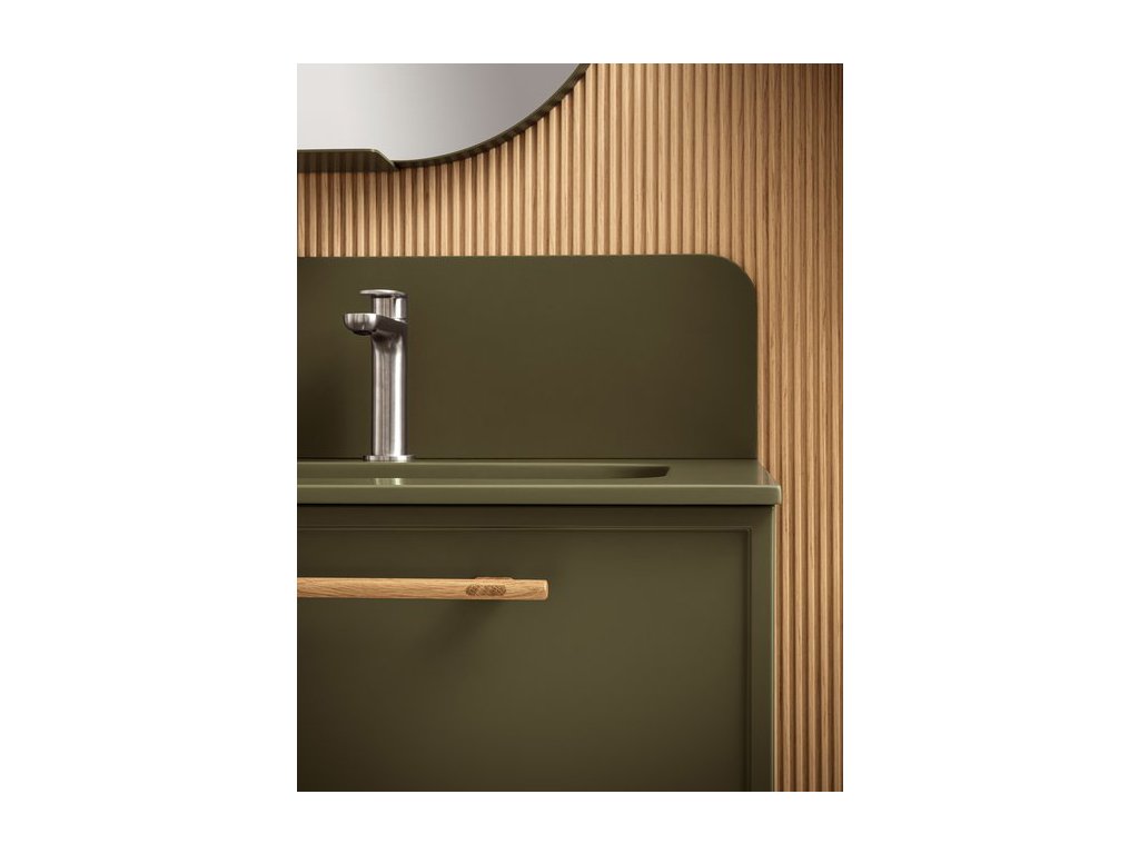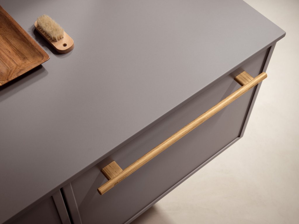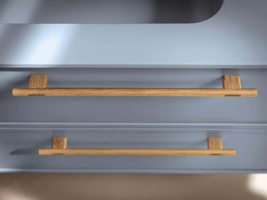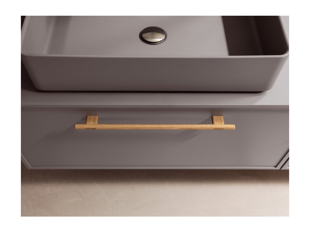 Rukoväť z prírodného dubového dreva dodáva kúpeľňovému nábytku prvok tepla a prirodzenosti a zároveň má aj nádych elegancie, ktorý vytvára príjemný kontrast k matnému laku.