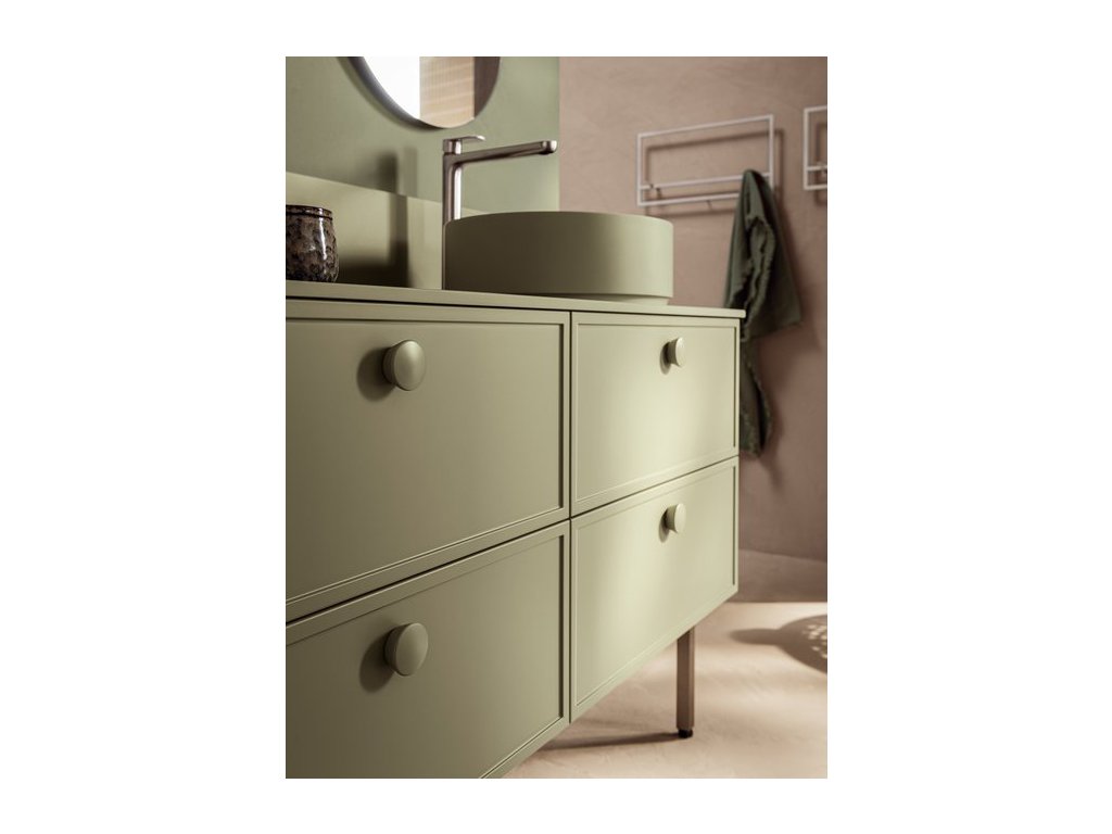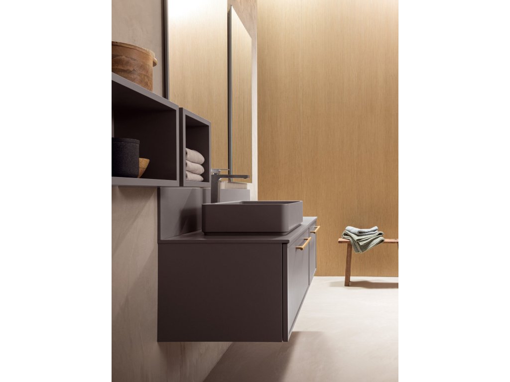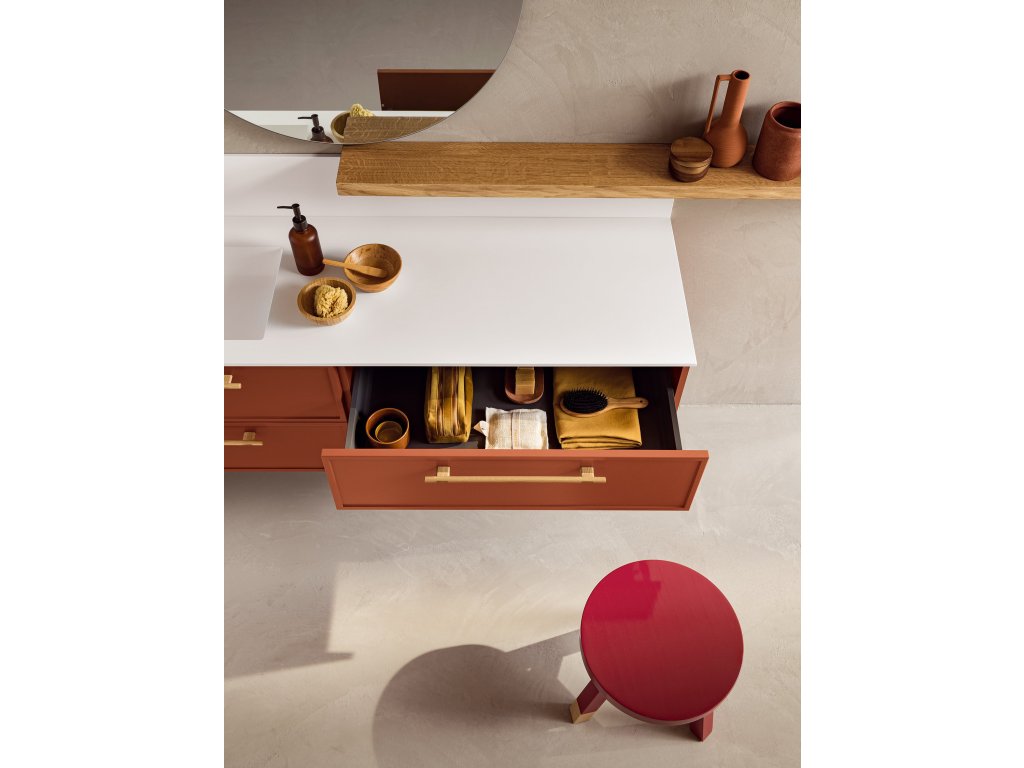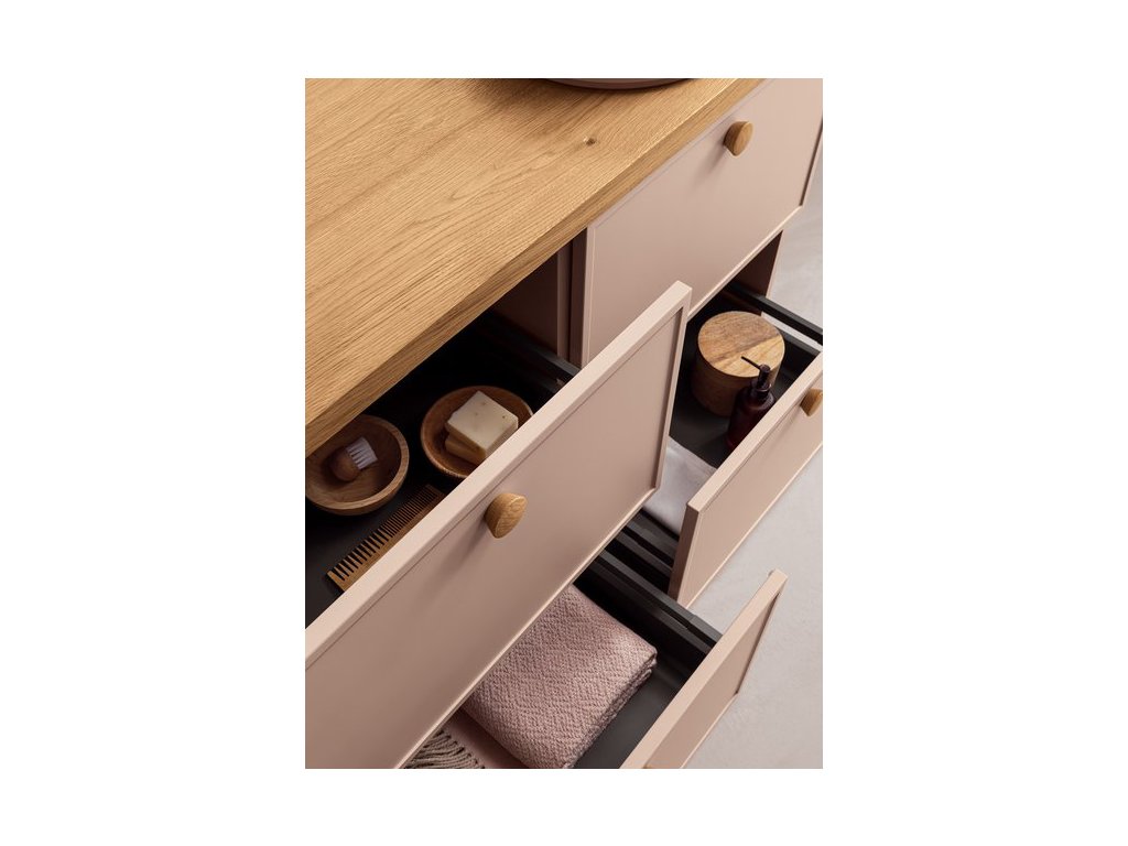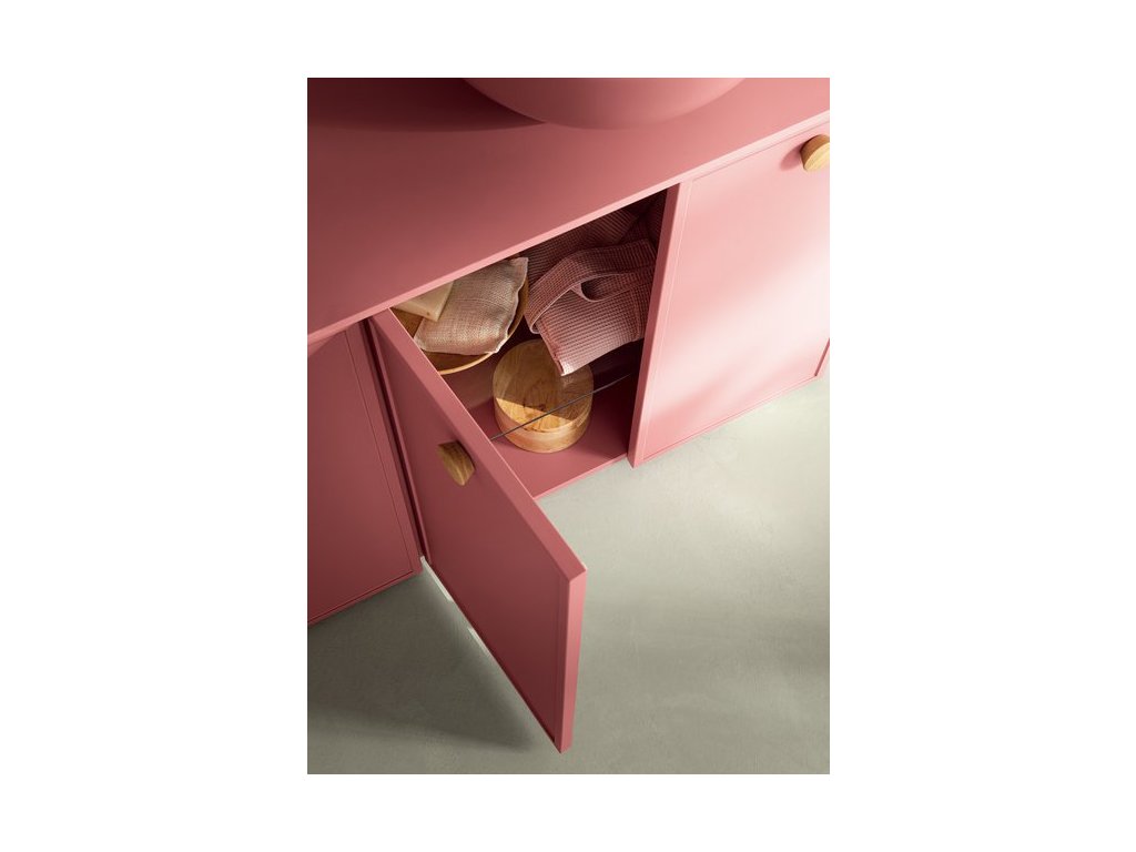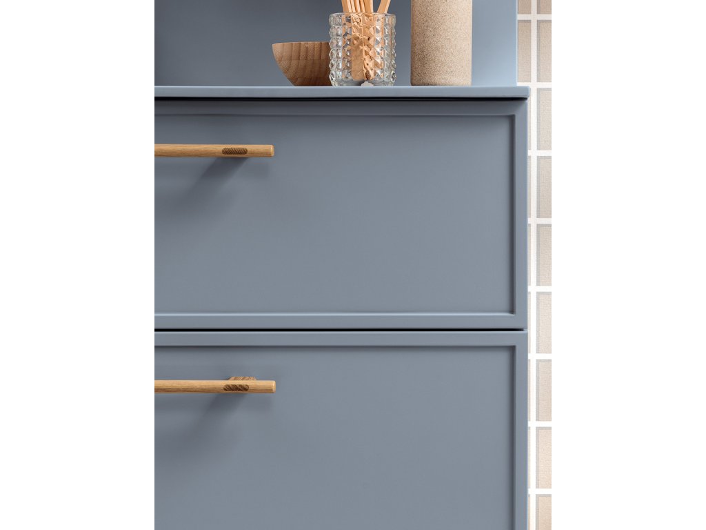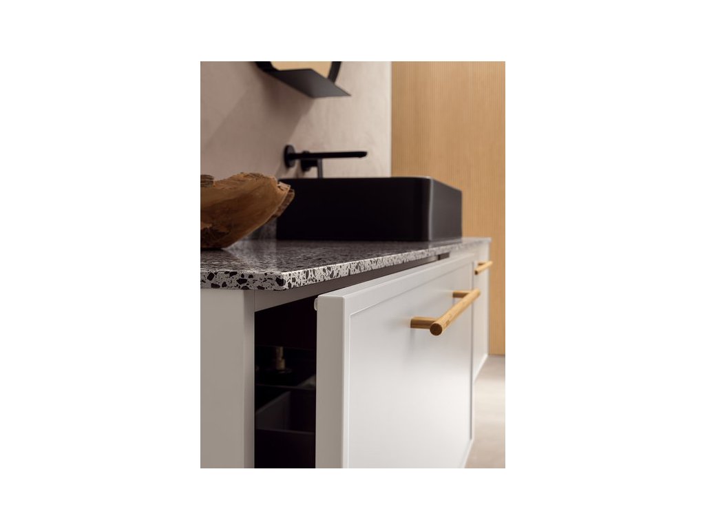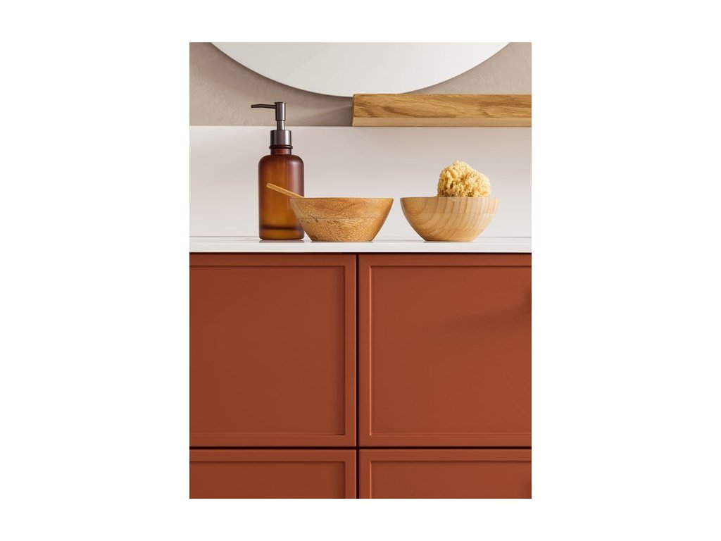 Rukoväť z prírodného dubového dreva dodáva kúpeľňovému nábytku prvok tepla a prirodzenosti a zároveň má aj nádych elegancie, ktorý vytvára príjemný kontrast k matnému laku.