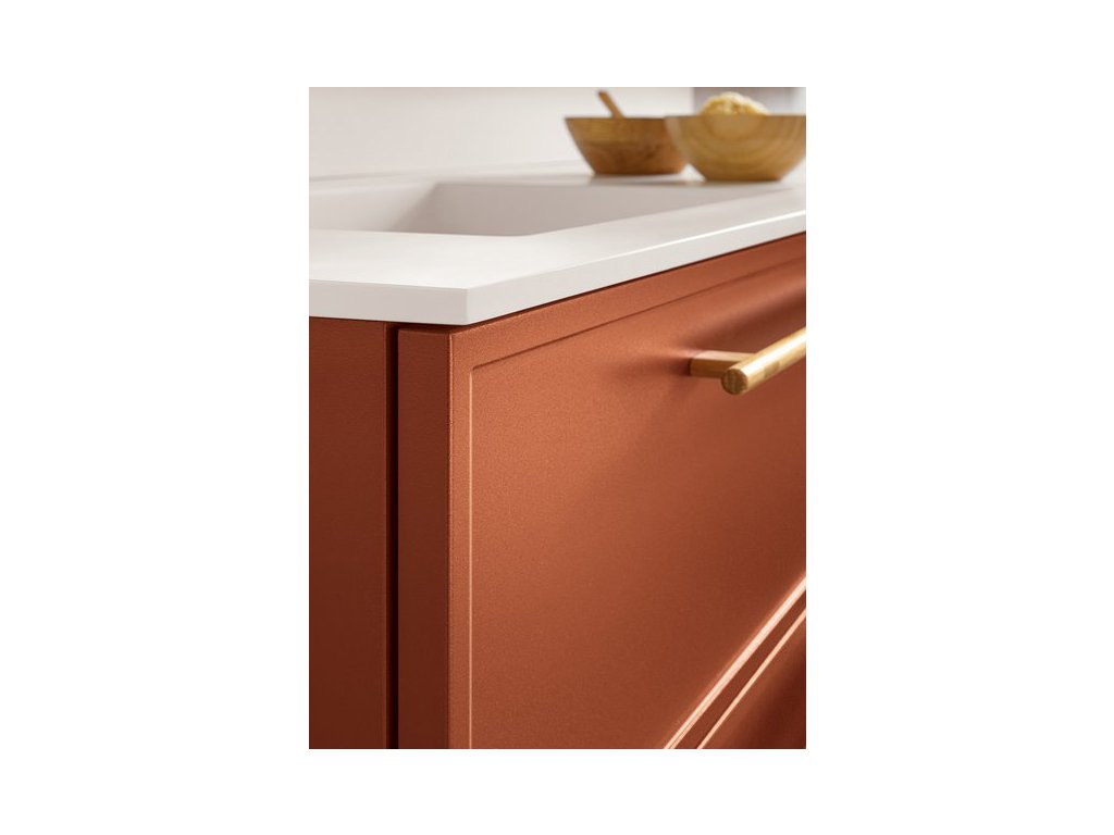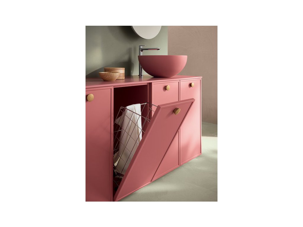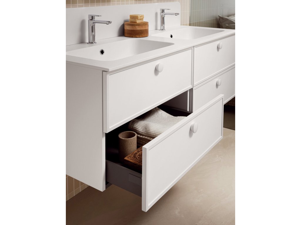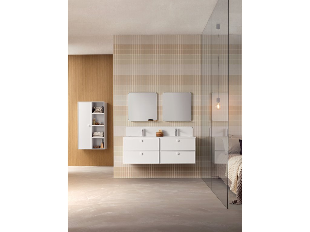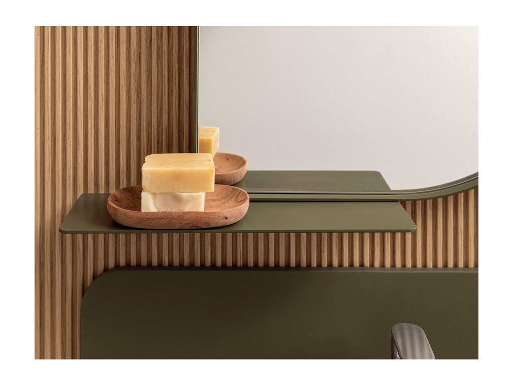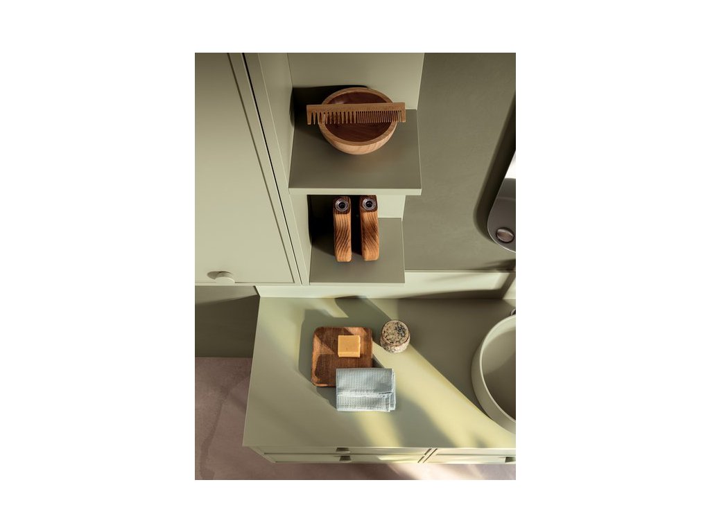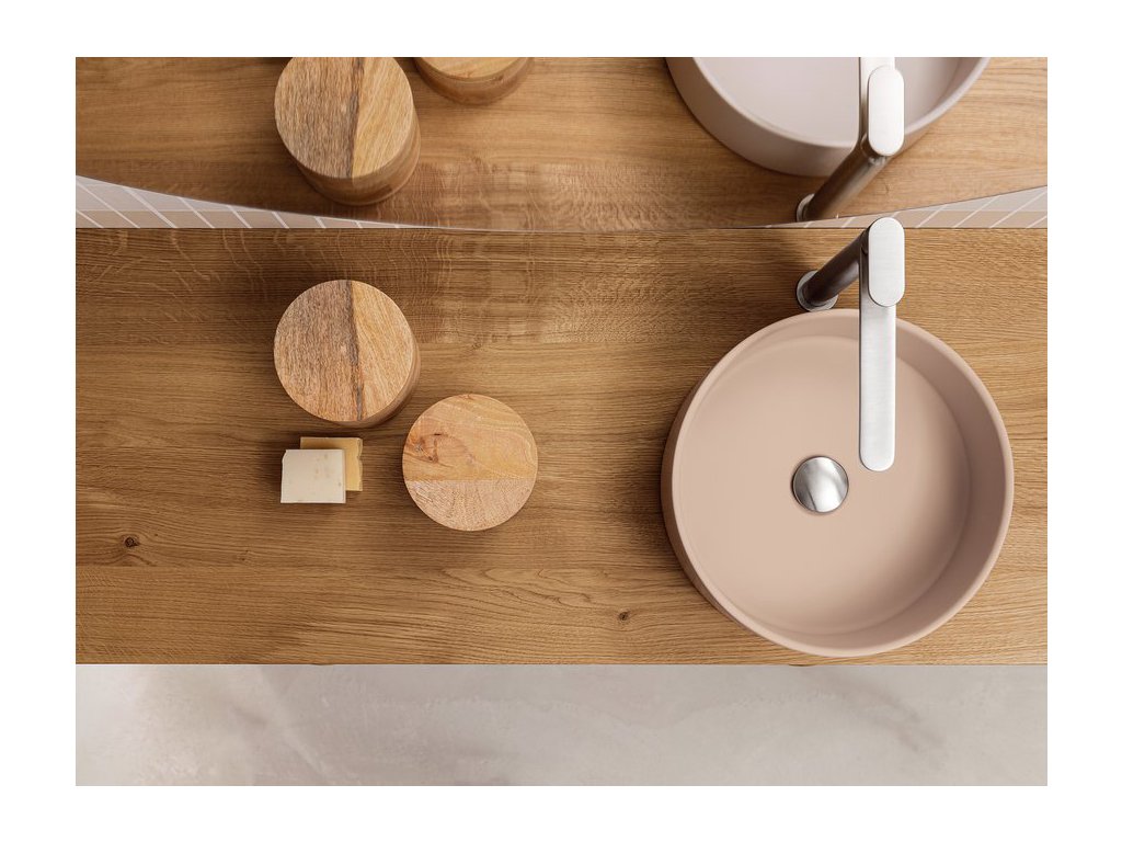 Rukoväť z prírodného dubového dreva dodáva kúpeľňovému nábytku prvok tepla a prirodzenosti a zároveň má aj nádych elegancie, ktorý vytvára príjemný kontrast k matnému laku.