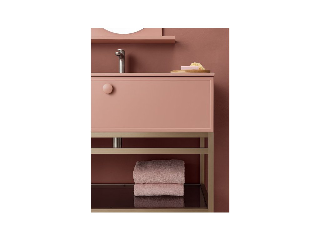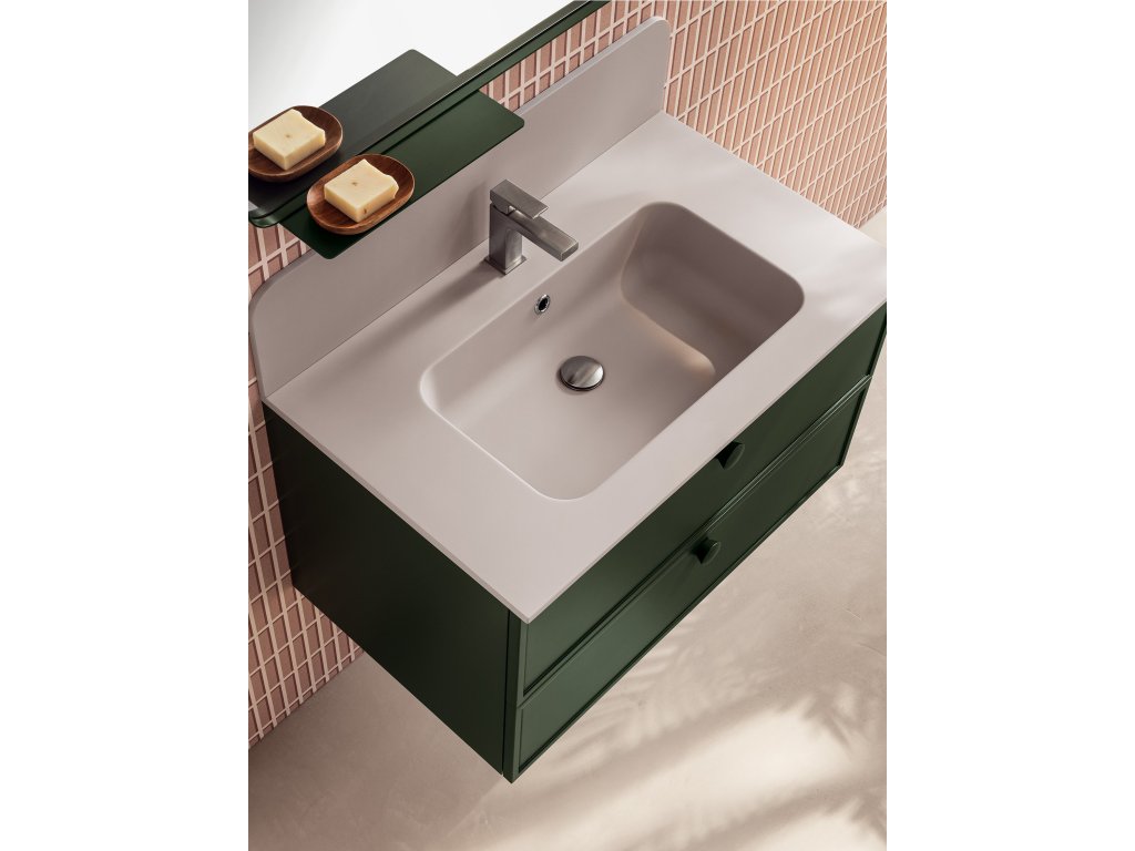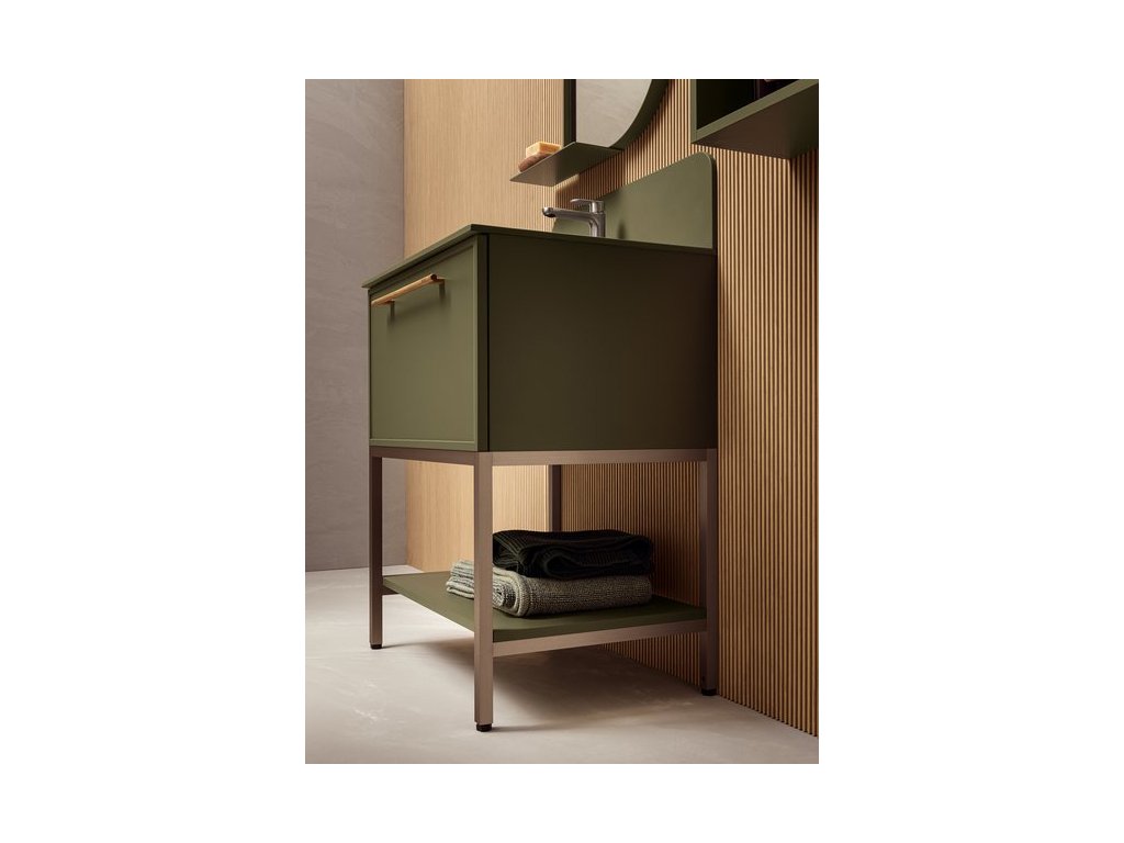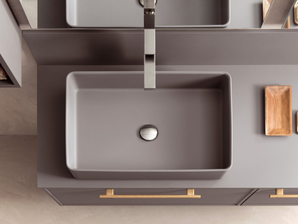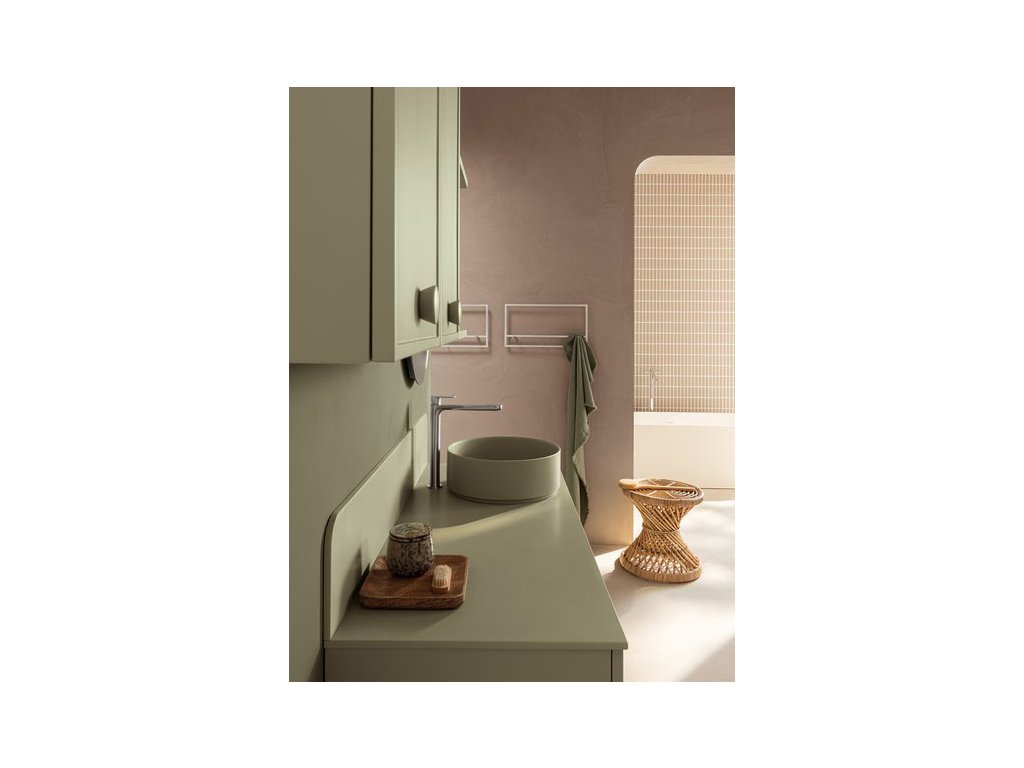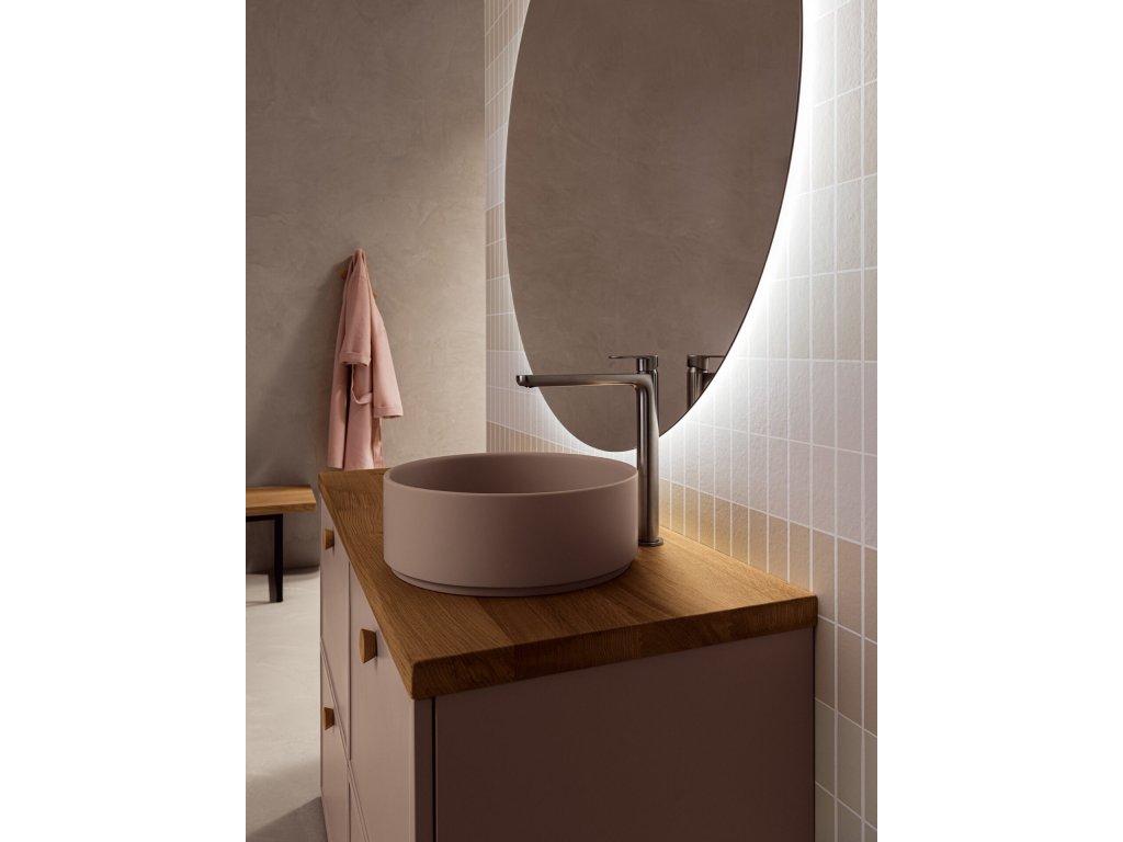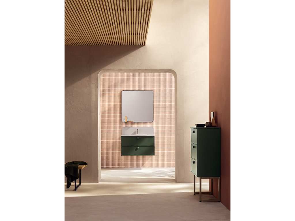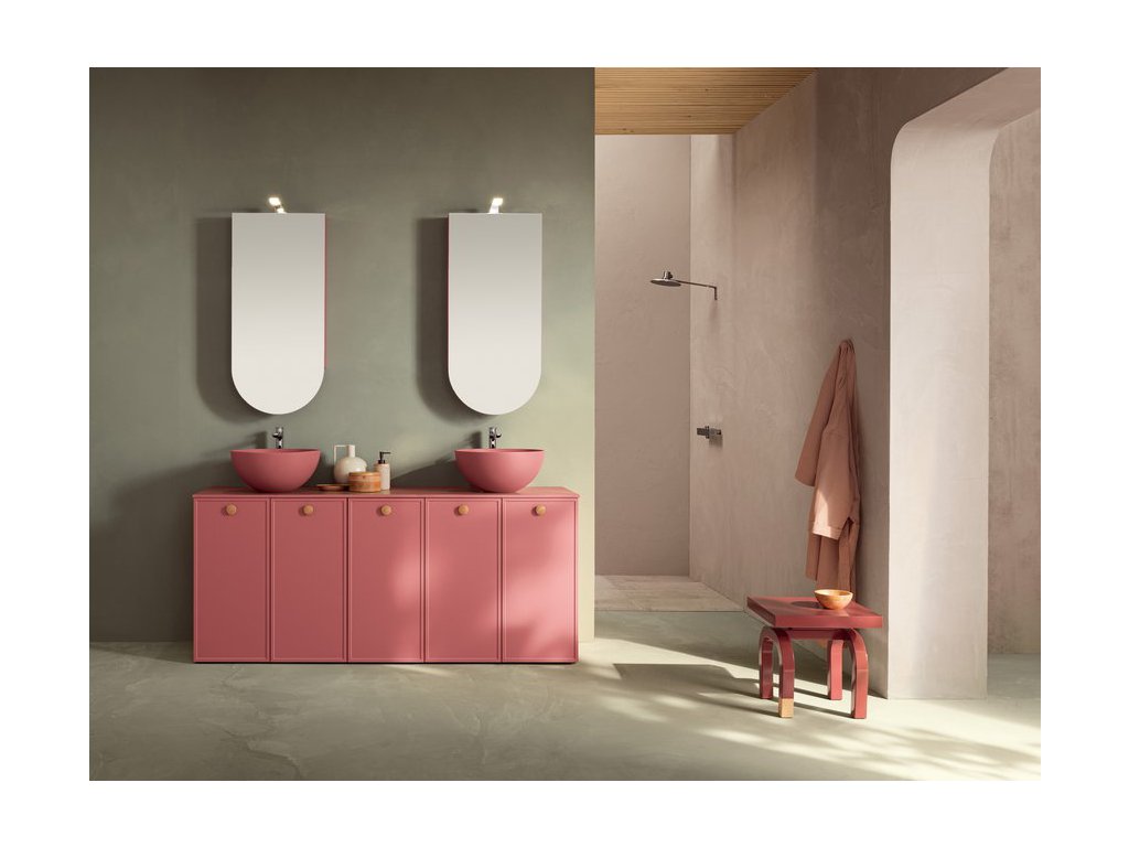 Rukoväť z prírodného dubového dreva dodáva kúpeľňovému nábytku prvok tepla a prirodzenosti a zároveň má aj nádych elegancie, ktorý vytvára príjemný kontrast k matnému laku.