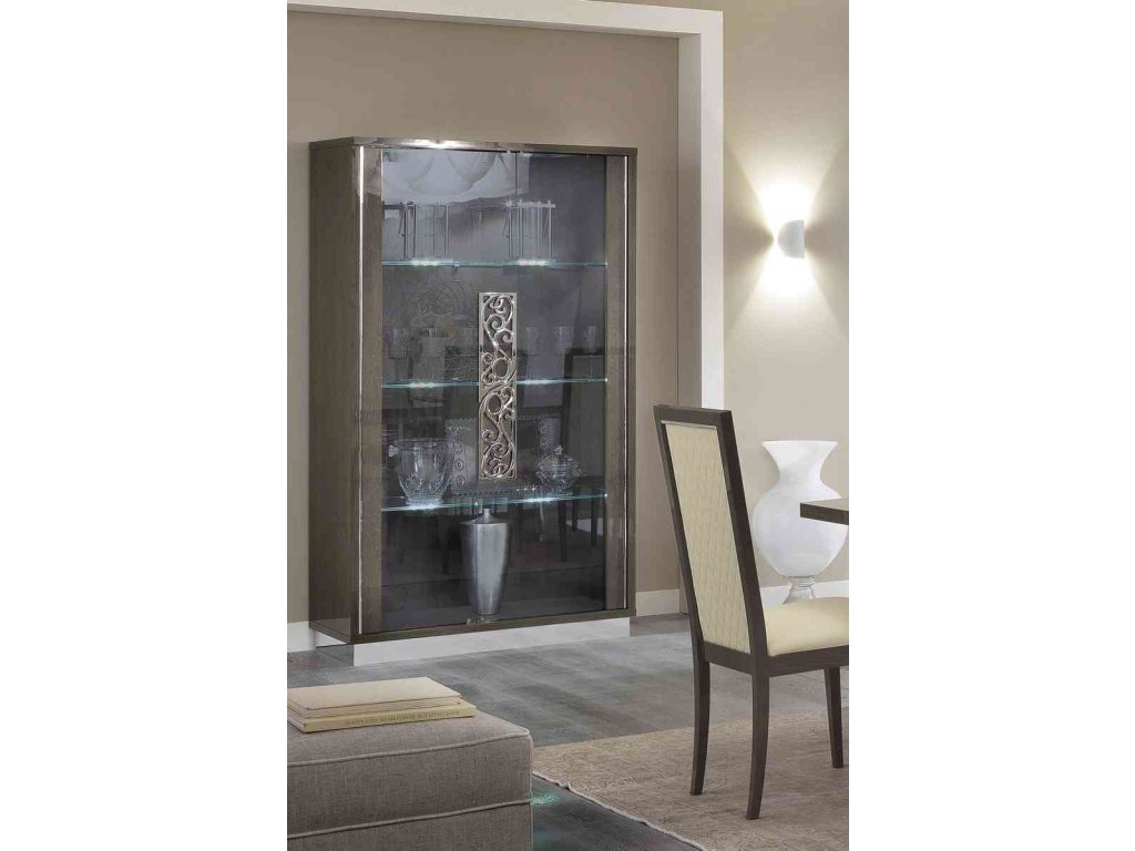 Priestranná 2 dverová vitrína je vyrábaná len z tých najkvalitnejších talianskych materiálov. Môžete si vybrať z dvoch druhov úchytiek SLIM a GLAMOUR.