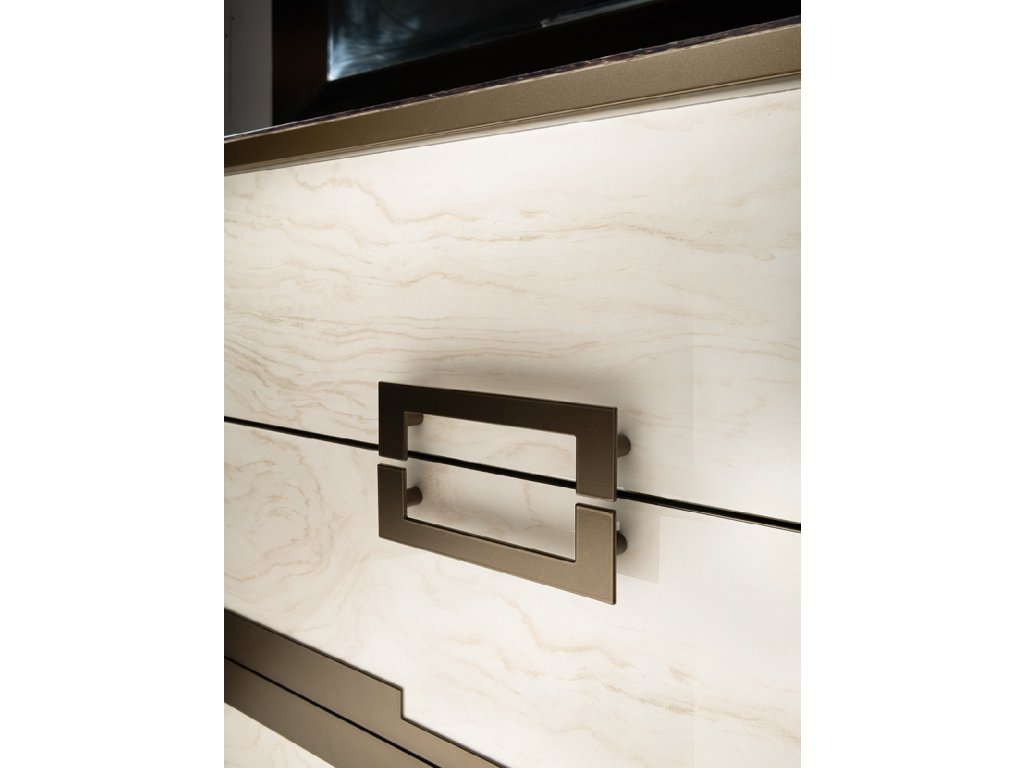 Kolekcia nábytku POESIA obsahuje krásne solitérne kúsky. Minimalistické detaily sú skombinované so sofistikovanosťou elegantných materiálov. Geometrický lineárny dizajn nábytku POESIA je doplnený rafinovanými materiálmi a detailmi. Vrchné dosky na jednotlivých kusoch nábytku POESIA sú vyrobené so sieťotlačou s efektom mramoru Emperador Dark. Kolekcia je vyrobená v bledej slonovinovej farbe v lesklom mramorovanom prevedení. Všetky kovové detaily sú teplej hnedej bronzovej farbe. Celkový dizajn kolekcie je smerovaný do hranatých lineárnych tvarov, spája sa tu jemnosť, objem, estetika a pohodlie. Nábytok z kolekcie POESIA je „100% MADE IN ITALY“.