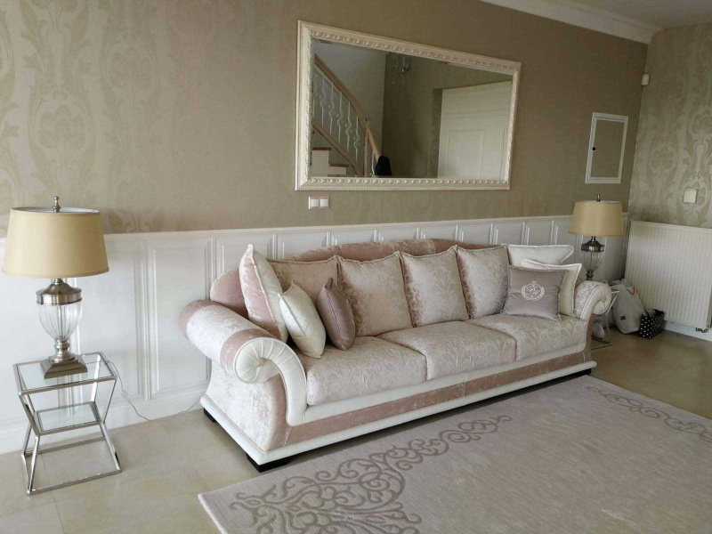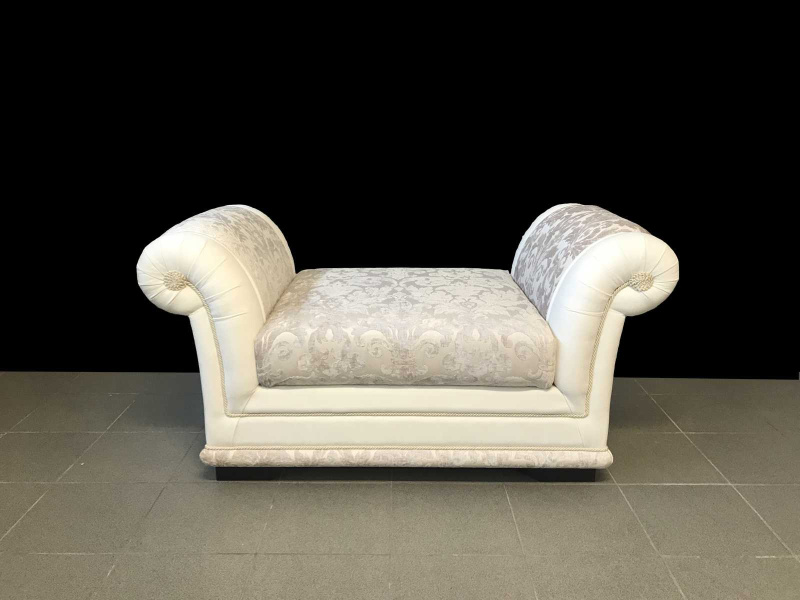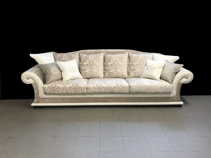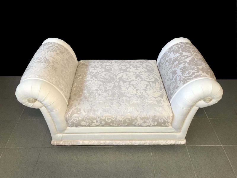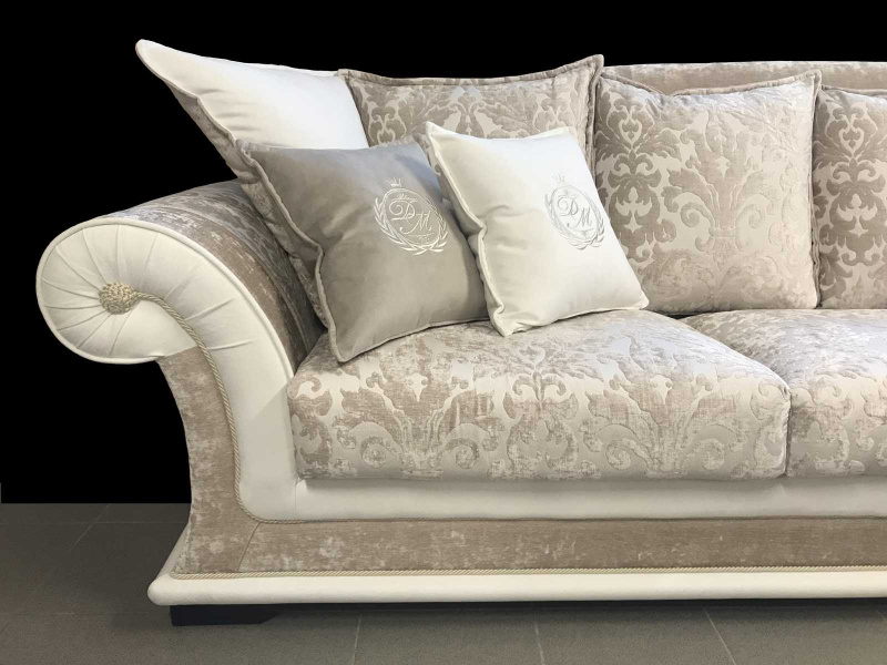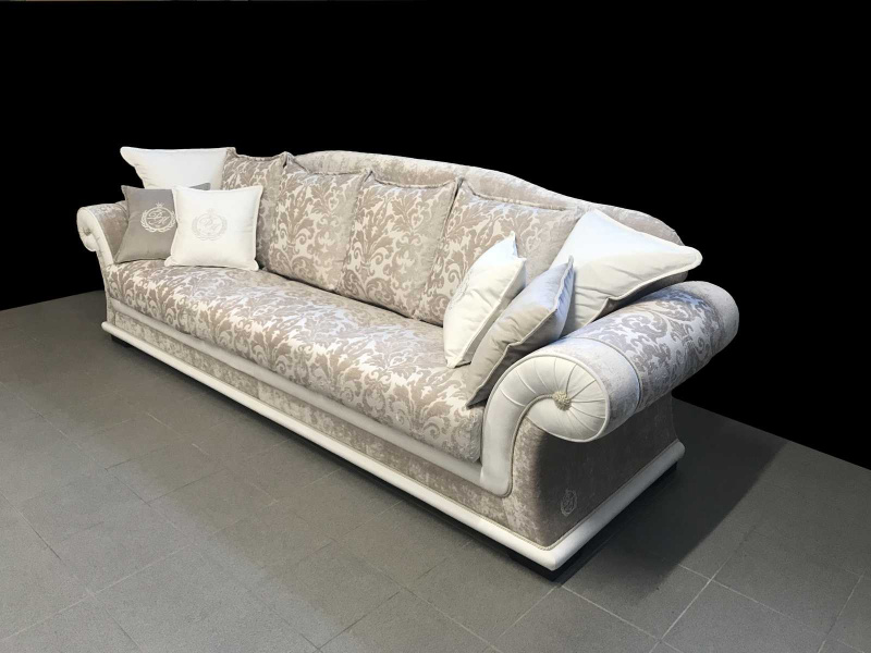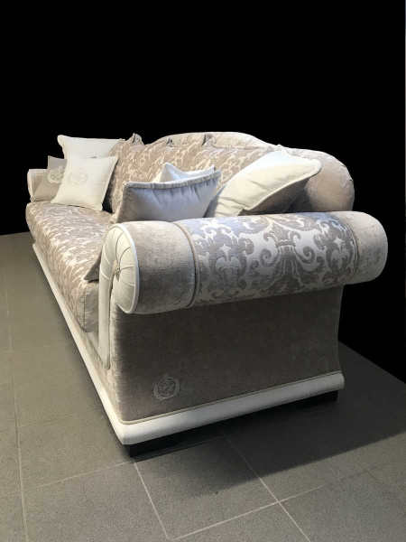 Štýlová sedačka EMPORIO je vyrobená v atypickom rozmere (šírka 300 cm), oproti štandardnej verzii divánu EMPOPRIO boli tiež zmenené detaily ako ozdobné strapce a ozdobné lemovanie. Sedačka na mieru bola skombinovaná so somierom – divánom, ktorý má úložný priestor a celkovú šírku 132 cm. Použité poťahované látky sú vysoko-odolné, dobre čistiteľné vodou a nie sú citlivé ani v bledých odtieňoch. Preto je talianska látková sedacia súprava vhodná na bežné každodenné užívanie bez obmedzenia.