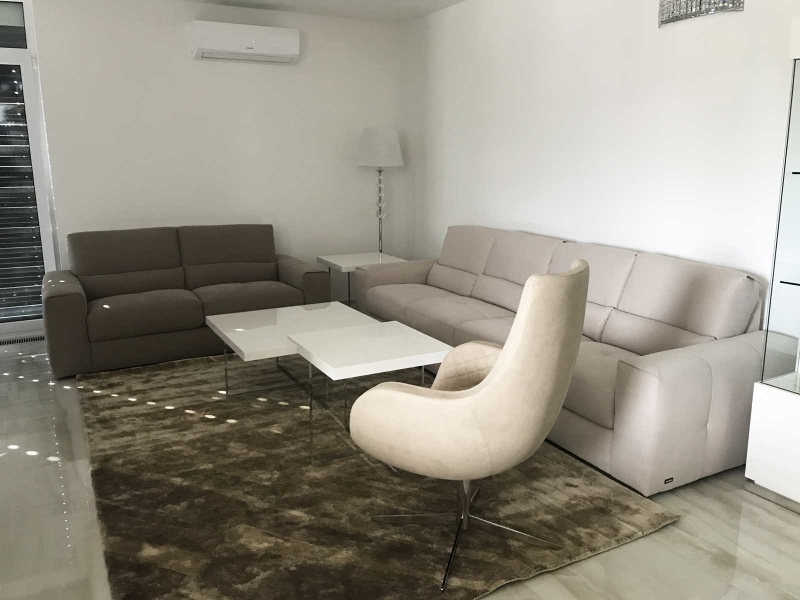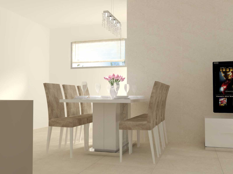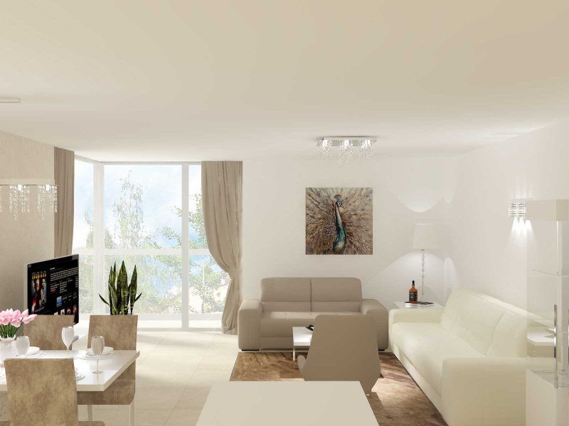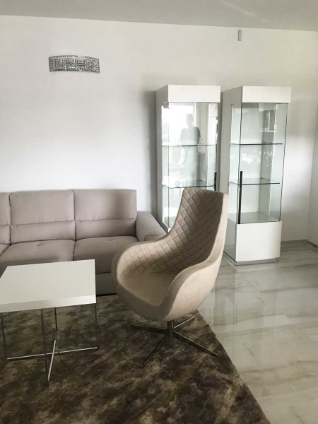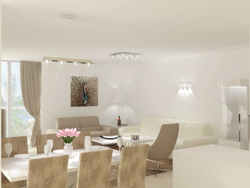 Obývačka je v byte spojená s kuchynskou linkou a jedálňou, teda bolo hlavnou ideou, zariadiť tento priestor funkčne, prakticky a najmä tak aby nestratil na svojej ľahkosti. Jedálenský stôl, stoličky, skrinka pod TV, vitríny a konferenčné stolíky sme zvolili z kolekcie CANOVA v prevedení biely vysoký lesk s dekorovaním bieleho mramoru. Sedačka mala byť pôvodne v rohová, avšak presvedčili sme o praktickosti nášho riešenia majiteľov bytu, teda sme použili 3 miestny a 2 miestny diván BUTTERFLY vo vysoko-odolnej látke, tieto sme doplnili o luxusné otočné kreslo na nerezovej podnoži VICTORIA v eko-koži Nabuk.