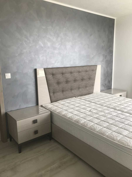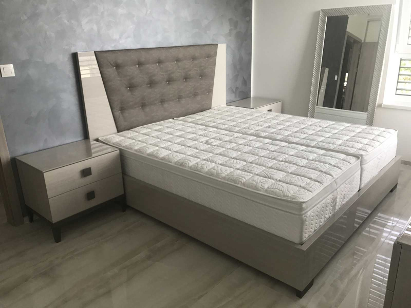 Spálňu sme zariadili kolekciou MONT BLANC, ktorá má jemnú textúru dreva vo vysokom lesku, posteľ sme doplnili o kvalitné zdravotné matrace QUEEN PREMIUM výška 26 cm od slovenského výrobcu MATRATEX.