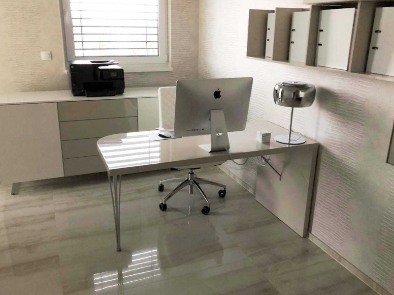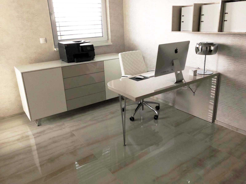 Pracovňa v byte bola podmienkou „pána domu“, zároveň sme sa snažili zachovať moderný lineárny funkčný dizajn. Pracovný písací stôl, zostava na stenu a komoda MEMPHIS je od talianskej značky TOMASELLA. Pohodlné dizajnové kožené pracovné kreslo ZEUS dopĺňa interiér a pohodlie v pracovni.
