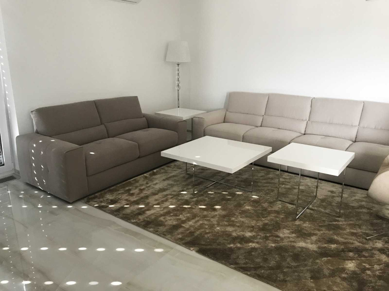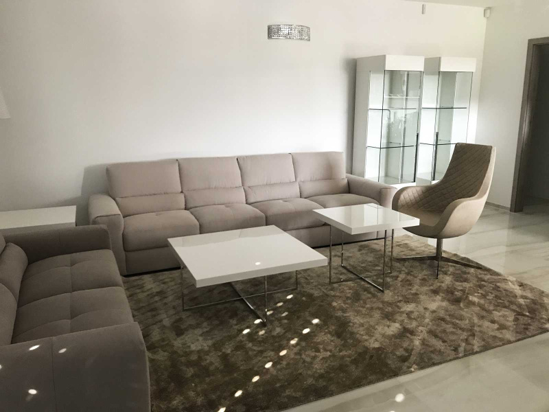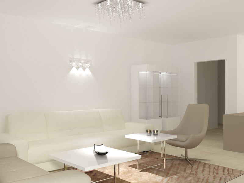 Celkovú príjemnú atmosféru sme dotvorili pomocou luxusného koberca MISTIC v rozmere 200×300 cm. Svietidlá sme zvoli v jemnom dizajne z kolekcie OPERA. Krásne zladenie zemitých farieb a bielej lesklej farby nám pomohlo zachovať elegantný no praktický interiér.