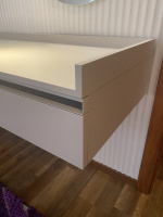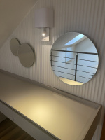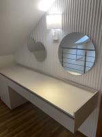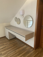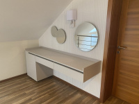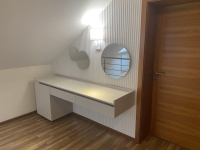 Tento vianočný darček pre dve mladé slečny sme navrhli a zrealizovali na podnet ich rodičov. Pre dievčatá si rodičia priali vytvoriť ich kútik, kde si môžu uložiť všetky svoje šperky, laky na nechty a podobné príjemné záležitosti. Rovnako mali potrebu vyplniť „zbytočný“ priestor na galérií schodiska. Zvolili sme modernú kvalitnú dizajnovú kolekciu ATLANTE od výrobcu talianskeho TOMASELLA. Vyskladali sme tento dvoj-toaletný stolík presne na mieru pre daný priestor. Potrebovali sme na stenu umiestniť svietidlo pre nedostatok svetla, ale mali zakázané akékoľvek búranie. Tak sme zvoli pre zakamuflovanie elektrických káblov exkluzívne 3D panely od výrobcu ORAC DECOR. Tieto nielen že splnili kryciu funkciu, ale aj ozvláštnili hladkú bielu stenu. Na stenu sme umiestnili zaujímavo riešené tri zrkadlá BOLLE v rôznych veľkostiach z kolekcie ATLANTE. Svietidlo sme zvolili biele elegantné a funkčné GEA od výrobcu IDEAL LUX. Toto svietidlo umožňuje dievčatám aj nabíjanie smartfónov a poskytuje dve rôzne možnosti osvetlenia. Celkovo sme priestor nezaťažili, zvolili sme prírodný odtieň nábytku MADREPERLA v kombinácií s dekorom bronzovej kože. Rodičia aj dievčatá boli nadmieru spokojní, čo nás samozrejme veľmi teší, je to vždy cieľ každého zariadenia interiéru, ktoré robíme alebo navrhujeme.