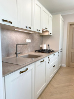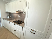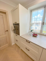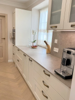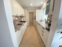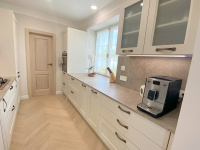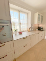 Priestor na kuchyňu nebol veľký, avšak podarilo sa nám zakomponovať všetky požadované časti vybavenia kuchyne. V kuchyni má majiteľka umývačku riadu, dostatok miesta na separovaný odpad, ku kuchyni patrí aj komora, a samozrejmosťou je veľká chladnička so šírkou 75 cm, rovnako ako aj umiestnenie rúry vo vyššej pozícií.
