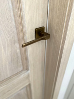 Dvere boli navrhnuté a vyrobené na mieru tak aby ladili s farbou parkiet a zároveň aby ladili s interiérom, ktorý má jemný rustikálny nádych, kľučky sme vybrali a dodali od COBRA.CZ
