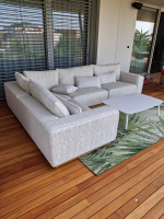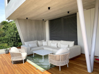 - Pre vytvorenie komfortnej zóny na terase sme zvolili záhradný diván DON – nadčasový kúsok s čistými líniami, ktorý perfektne ladí s teplým odtieňom drevenej podlahy. V kombinácii s konferenčným stolíkom vzniklo príjemné miesto na rannú kávu aj večerné rozhovory.