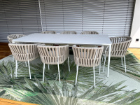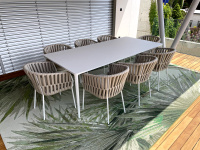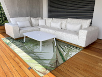 - V jedálenskej časti dominuje elegantný stôl BAHAMAS v bielej farbe, ku ktorému sme zladili pohodlné a vzdušné stoličky SOHO. Celý priestor sme ešte zútulnili štýlovým exteriérovým kobercom AMAZZONIA od značky SITAP, ktorý vytvoril príjemnú domácu atmosféru aj pod holým nebom.
