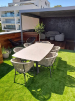 Bolo by hriechom zabudnúť na jedálenské sedenie – zvolili sme stôl MILO s HPL doskou a hliníkovou podnožou v rozmere 200×105 cm v kombinácií s pohodlnými stoličkami PORTOFINO.