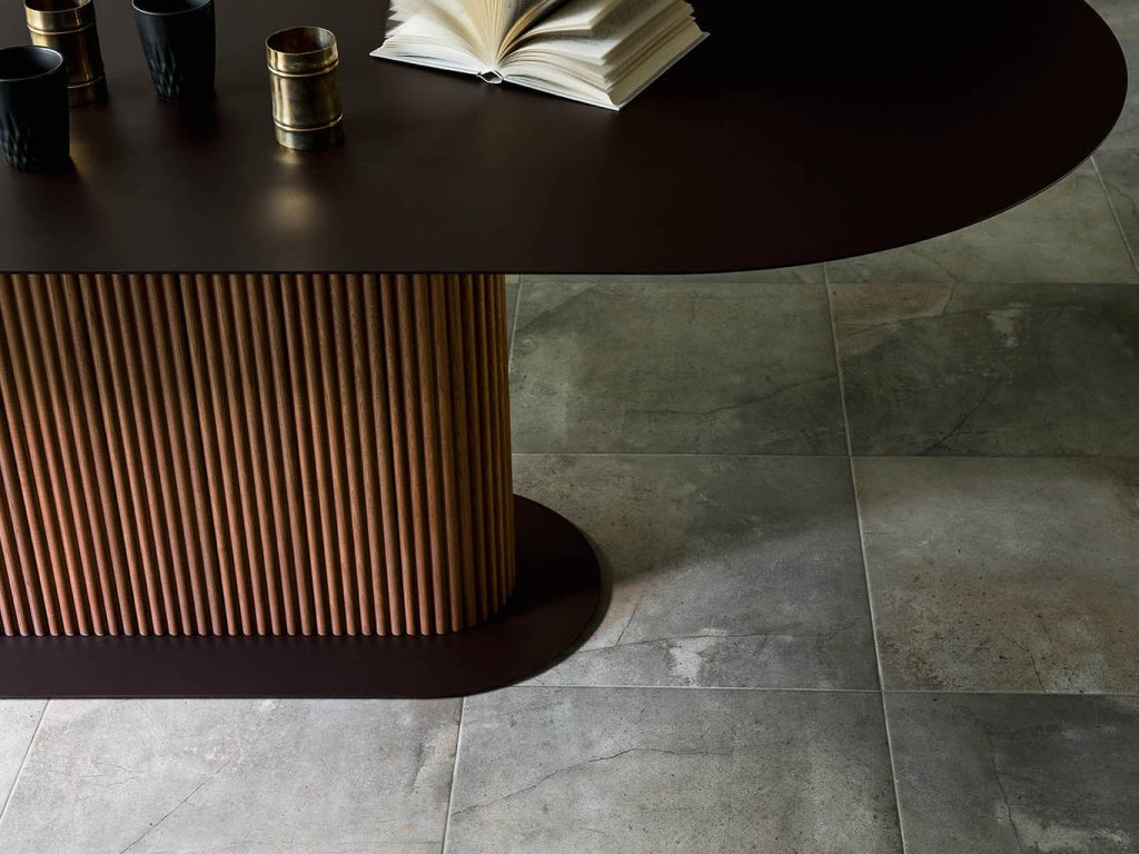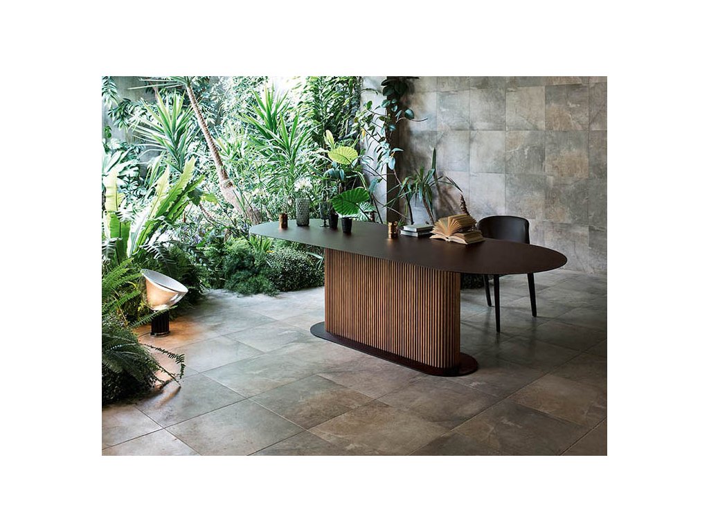 Vďaka drevené podnoži opracované v pásoch spoločne s hornou doskou stola v mramore, kameni či kovu, premení akúkoľvek miestnosť v nadčasový priestor.