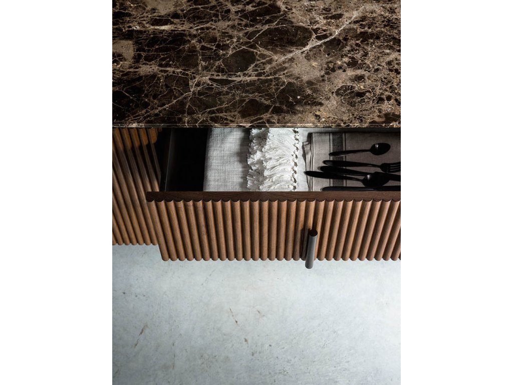 Vďaka drevenému telu opracovanému v pásoch spoločne s hornou doskou v mramore, kameni či kovu, premení akúkoľvek miestnosť v nadčasový priestor.