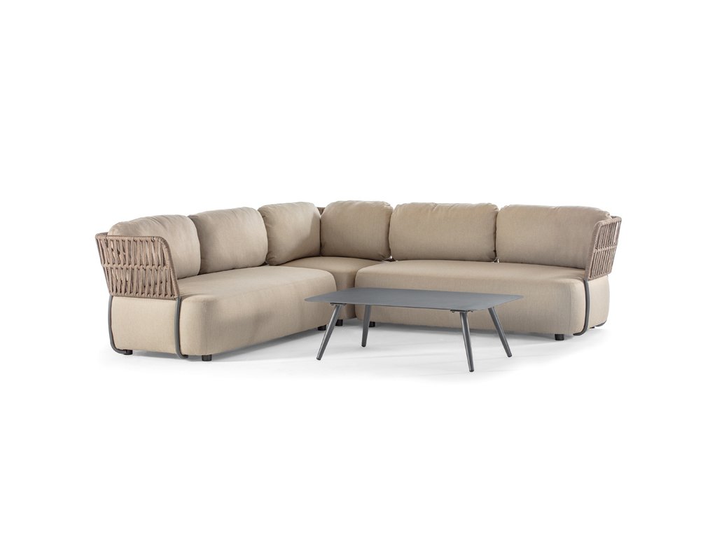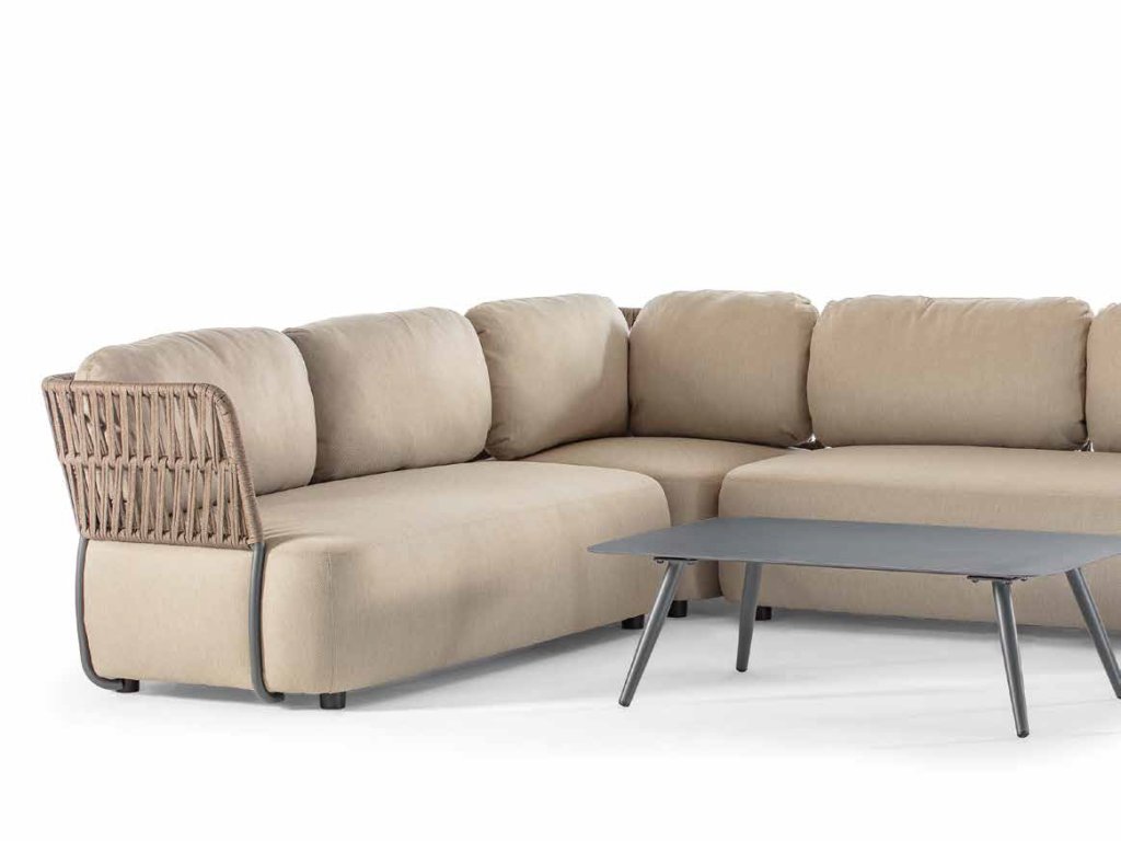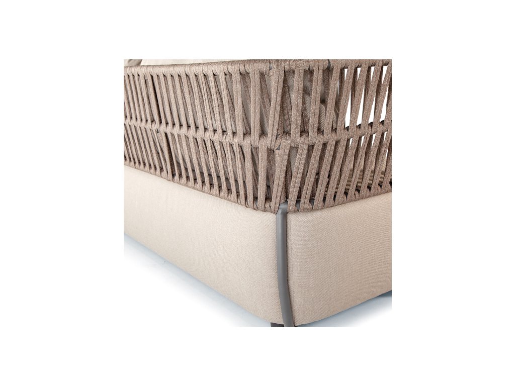 Exteriérové sedenie má hliníkovú konštrukciu v antracitovej a černej farbe, s výpletom z polyolefinového lana. Čalúnené vankúše majú odnímateľné poťahy a sú vyrobený z vodoodpudivej akrylovej látky a vode odolnej gumy.