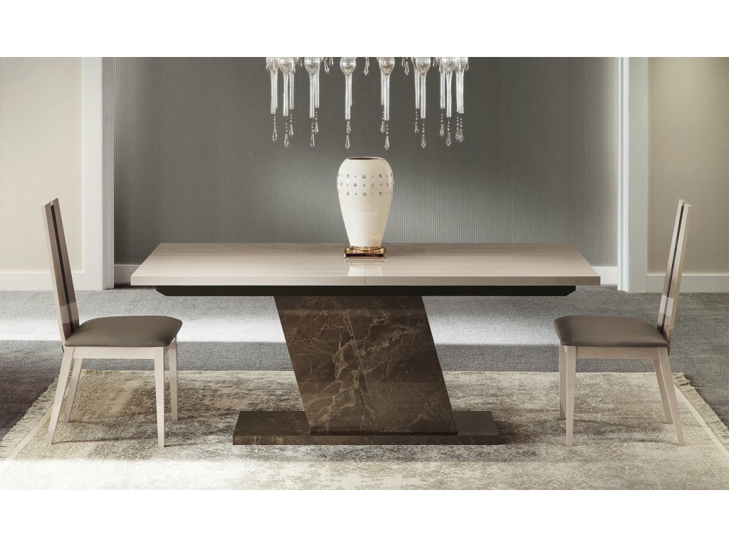 Moderný dizajn s elegantnými aspekty, ktorý spája svetlou drevenou eko-dyhu vo vysokom lesku a zaujímavý dekor tmavohnedého mramoru.
