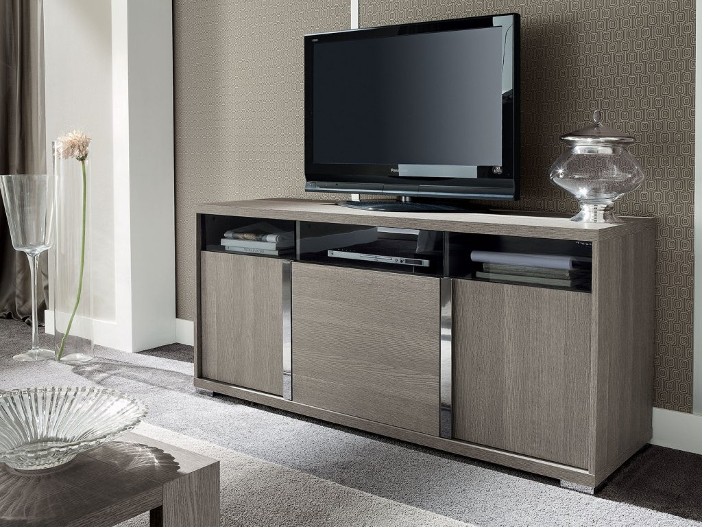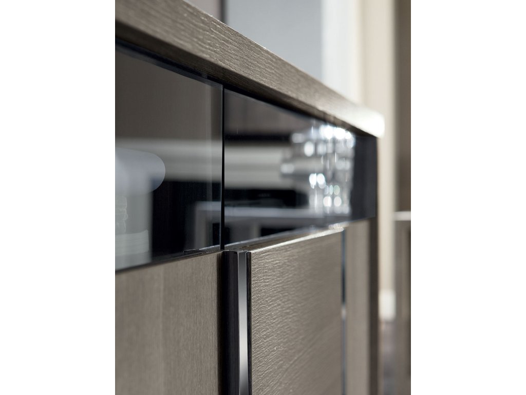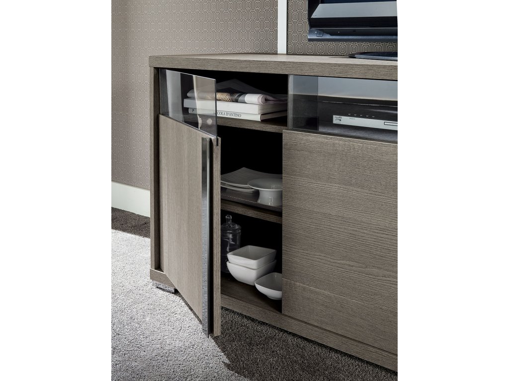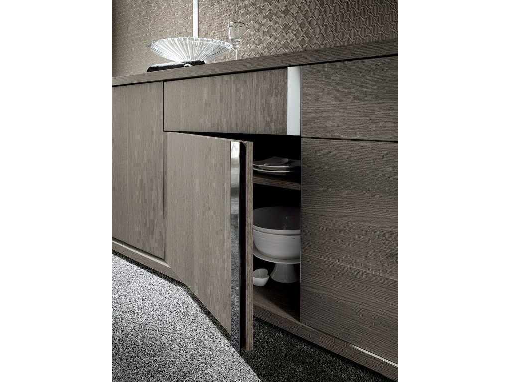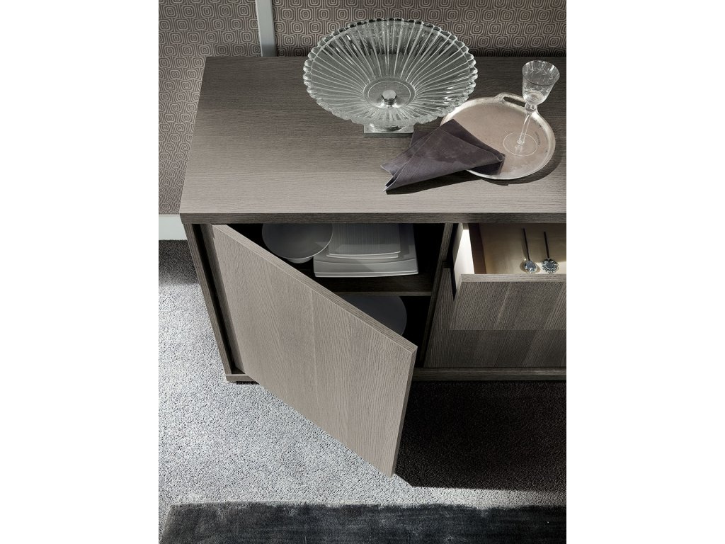 Jej eko dyha v úžasnej šedej farbe matného dubu, v kontraste s lesklými chrómovými detailmi podčiarkuje celkový dizajn tejto jedinečnej kolekcie a môžete s ňou zariadiť nielen obývačku, ale aj jedáleň, pracovňu alebo spálňu.