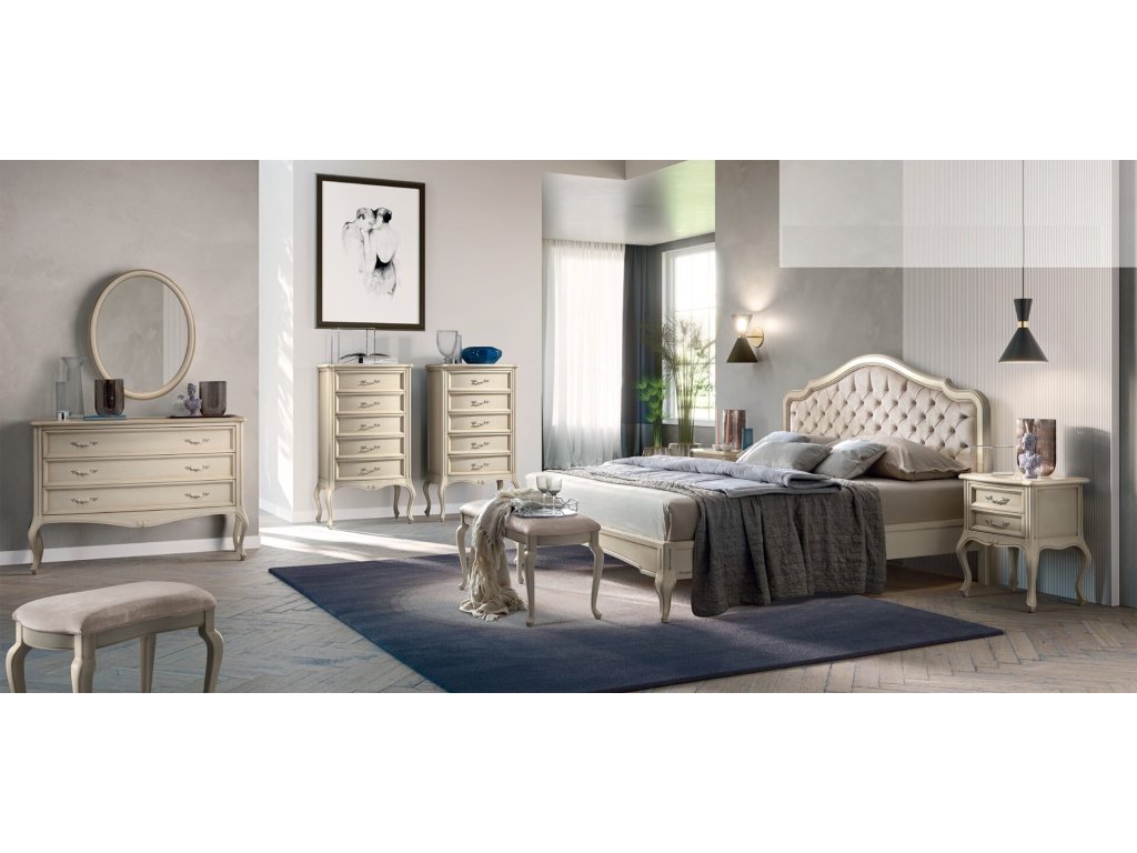 Krémové prevedenie nábytku do spálne VERDI AVORIO PATINATO je možné objedať bez strieborného dekoru, ktorý je aplikovaný na jednotlivé kúsky ručne. Tento dekor je za príplatok.