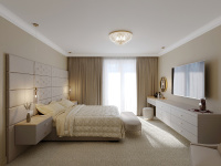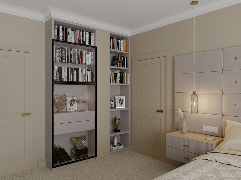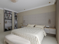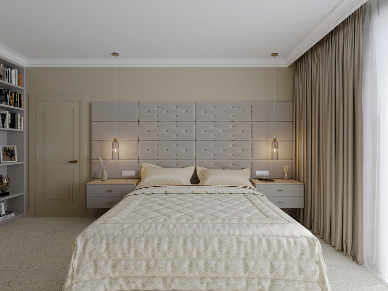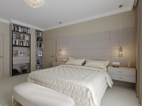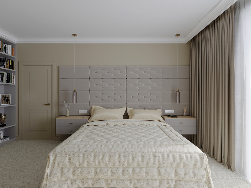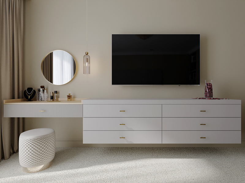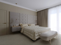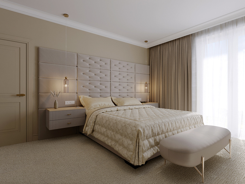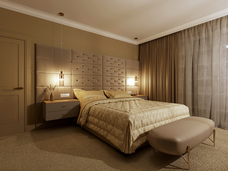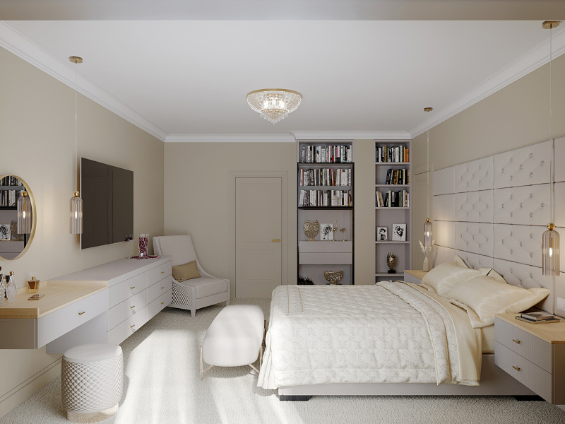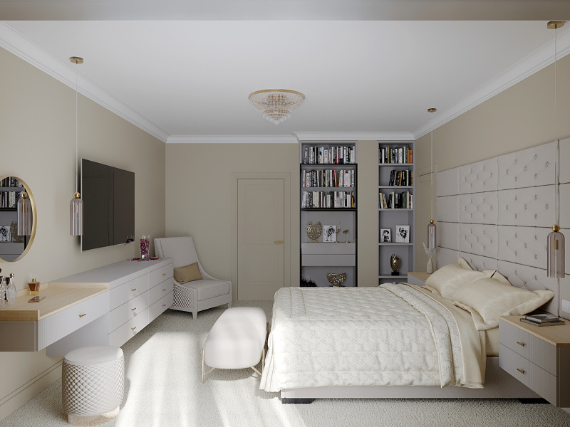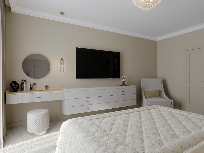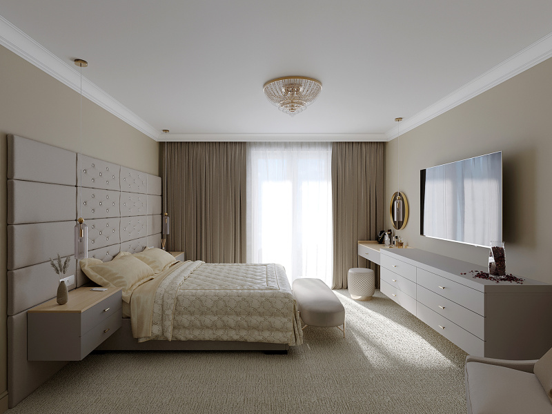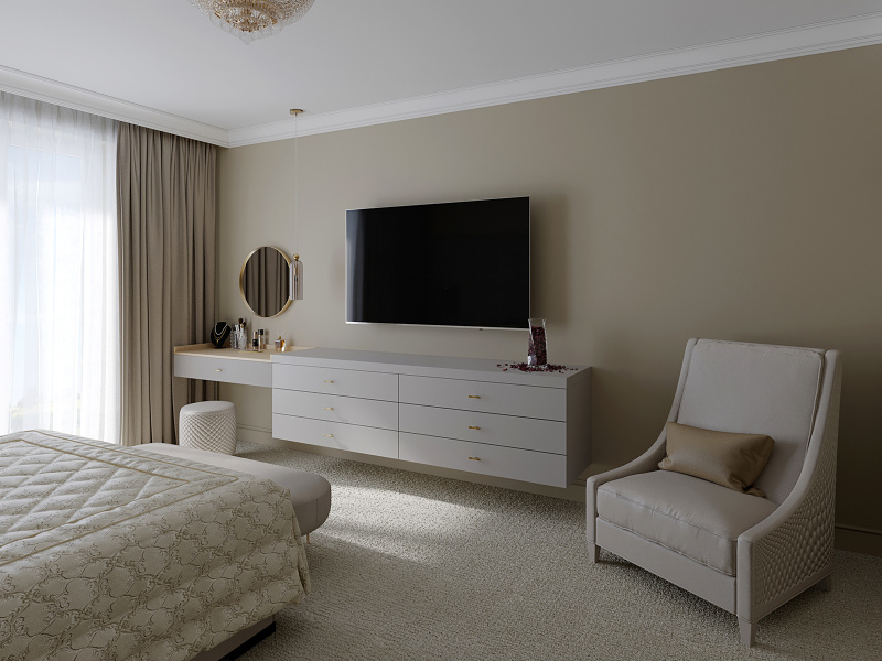 Jedná o spálňu spojenú s veľkým šatníkom. Základom návrhu spálne je čalúnená posteľ na mieru, kde sme skombinovali lineárne tvary čela ktoré bude umiestnené priamo na stene s gombíkmi Swarovski. Posteľ sme doplnili modernými lineárnymi nočnými stolíkmi od firmy TOMASELLA, ktoré budú zavesené na stene, a budú súčasťou čalúneného čela. Na opačnej stene sme vytvorili kozmetický kútik, ktorý je spojený s praktickými komodami. Nad tieto sme podľa požiadavky majiteľa umiestnili televízor. Táto zostava je taktiež zavesená celá na stene a pôsobí tak vzdušne aj napriek robustnému rozmeru. Vedľa komody sme vytvorili miesto pre pohodlné dizajnové kreslo. Súčasťou spálne je aj úložný priestor, ktorý nám vznikol prechodom komína zo spodného podlažia. Na podlahu sme zvolili koberec a samozrejmosťou sú zatemňovacie závesy alebo praktické osvetlenie v izbe. Verím, že sa tento návrh spálne bude páčiť ako majiteľom tak i vám. V prípade, že si neviete dať rady s s vašim interiérom, neváhajte nás kontaktovať.