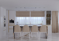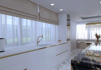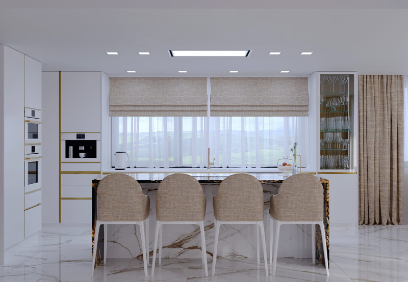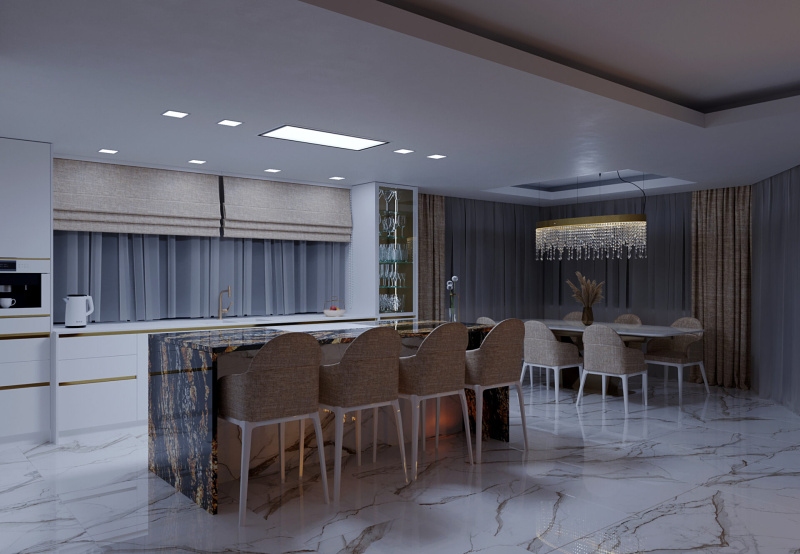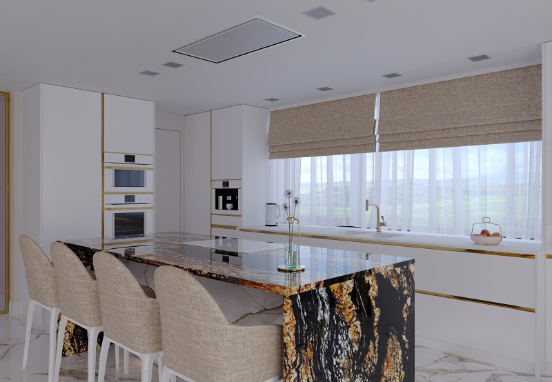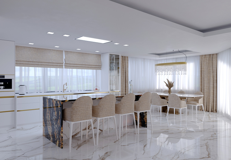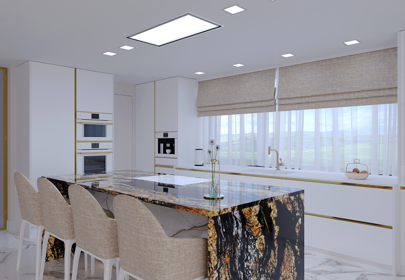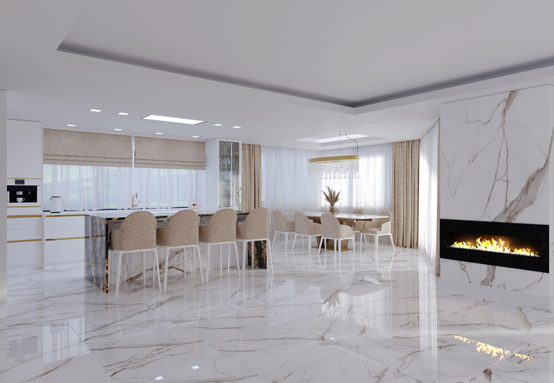 Do priestoru sme navrhli kuchynskú zostavu v lesklom prevedení v kombinácií s pracovnou doskou FENIX a na ostrove sme použili brazílsku žulu. Na podlahu a obklady sme navrhli taliansku dlažbu s dekorom mramor CALACATTA.