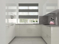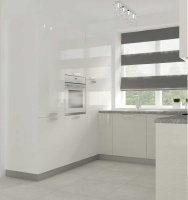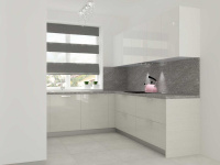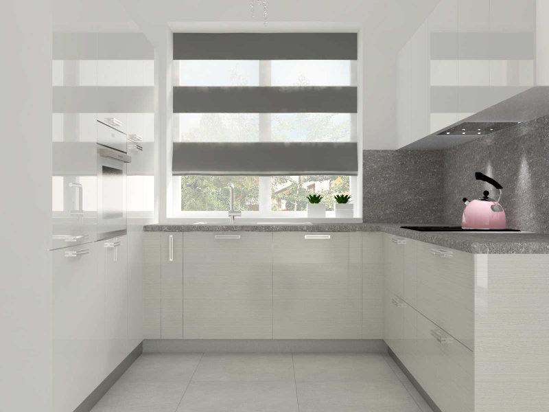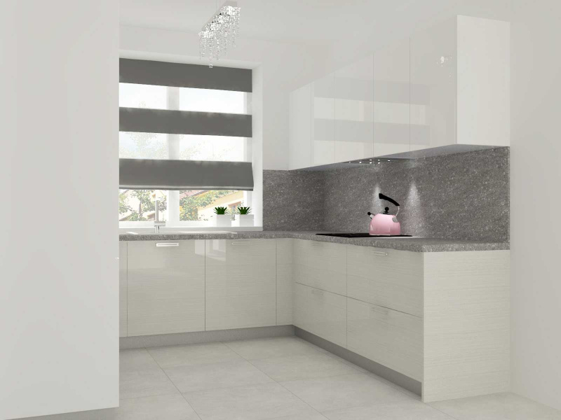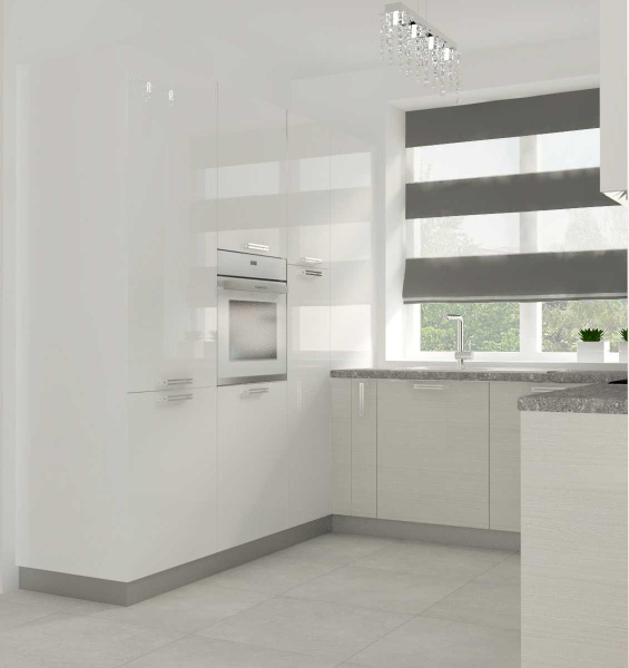 V tomto prípade išlo o kompletnú službu pre klientov. Doslova od návrhu riešenia modernej kuchyne v tvare U, realistickej 3D vizualizácie kuchyne až po samotnú realizáciu kuchynskej linky z kolekcie SLIM. Sterilnú lesklú bielu farbu sme oživili štruktúrou dreva vo vysokom lesku PERLA. Priestor určený pre kuchynskú linku nebol veľmi veľký a tak sme mali výzvu, aby sme v kuchyni navrhli všetko tak, aby bola kuchyňa čo najergonomickejšia a najmä funkčná a zostala moderná – dizajnová. Jednu časť tvoria vysoké skrine, kde sme umiestnili vstavanú chladničku značky CANDY, spolu so vstavanou bielou rúrou a skrytou mikrovlnnou rúrou. V rohu kuchynskej linky je umiestnená potravinová skriňa. Pod oknom sme umiestnili podľa požiadavky klienta umývadlo a umývačku riadu. Ostatná plocha rohovej kuchynskej linky bola riešená najmä ako odkladacia plocha a plocha na varenie.