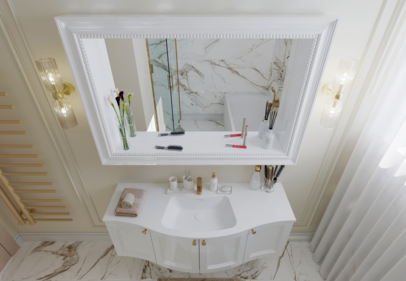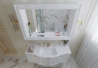 Nad umývadlom sme zvolili zaujímavú dizajnovú skrinku s ozdobným rámom a LED osvetlením, takto nám vznikla praktická polička, kde si majiteľka môže prehľadne rozložiť svoje potrebné drobnosti.